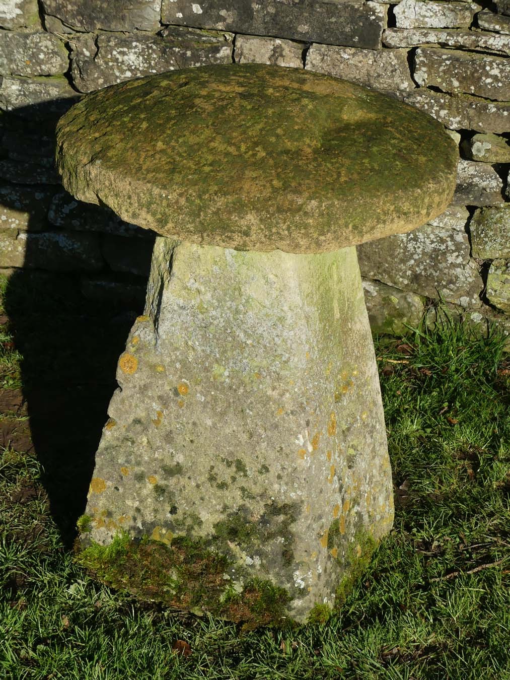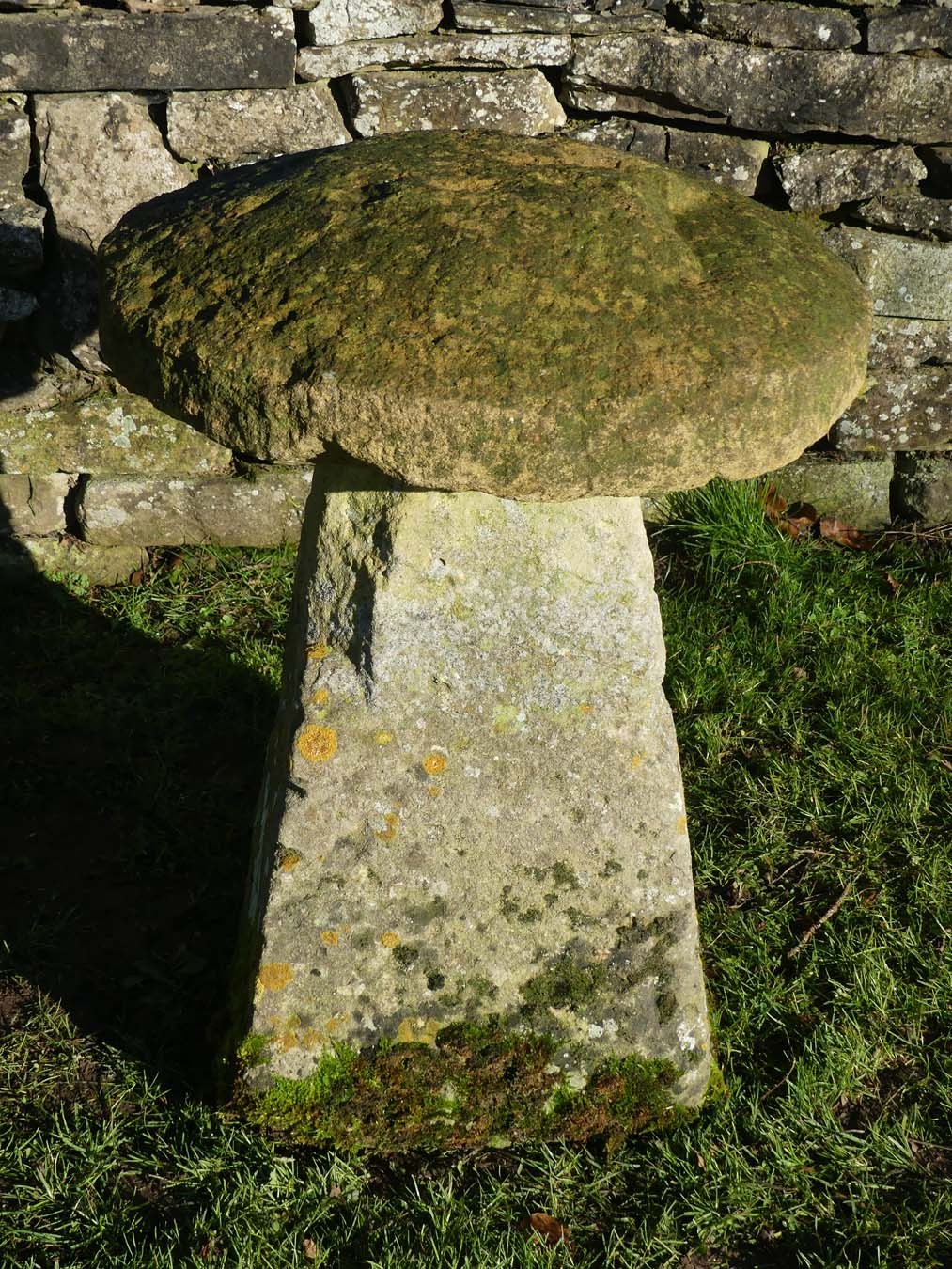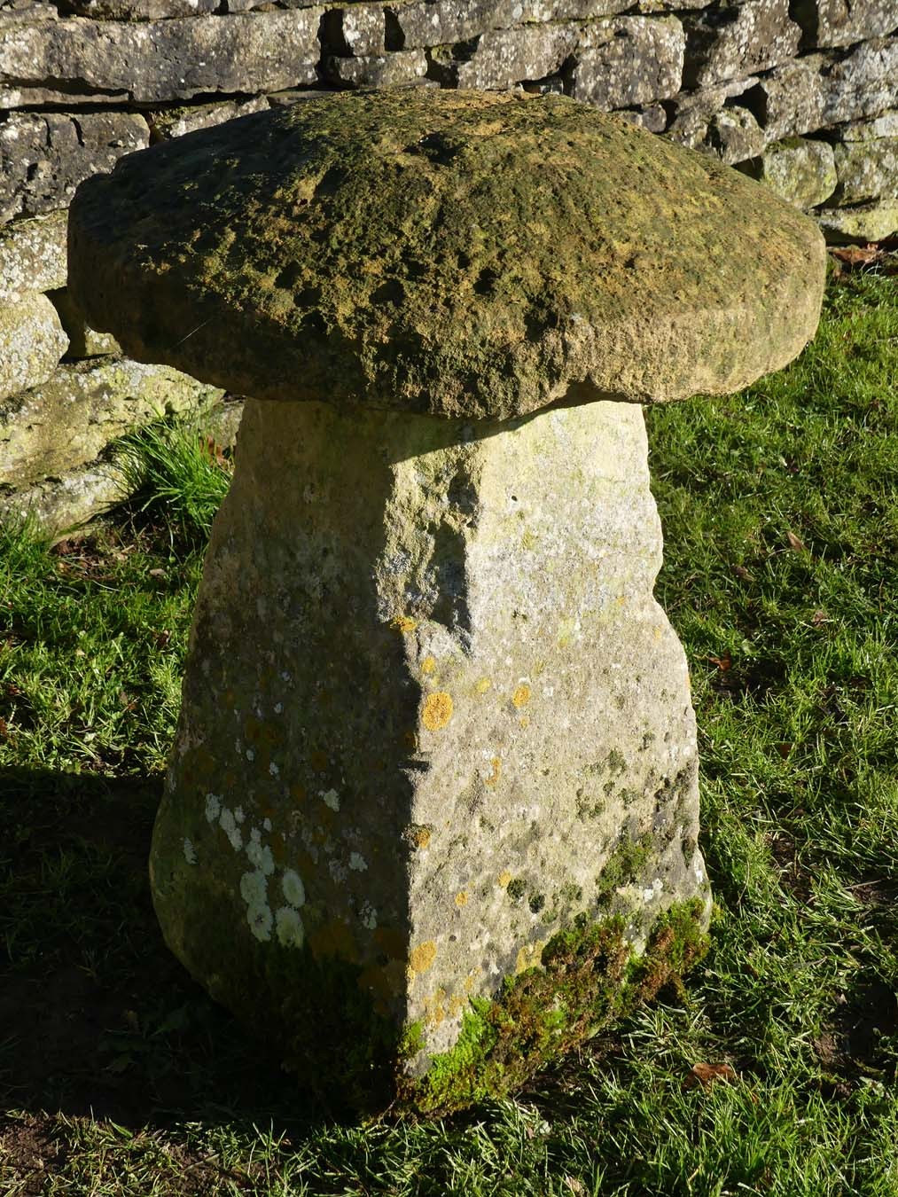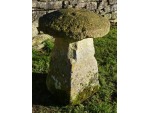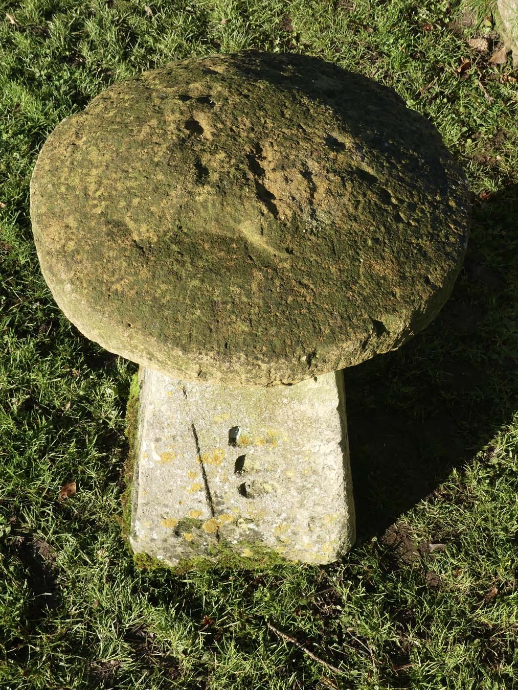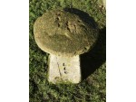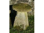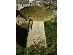 An antique limestone staddle stone from South Worcestershire, the round top on a tapered square base. This is a genuine old staddle stone but is slightly smaller than most staddle stones of this type.