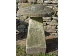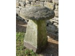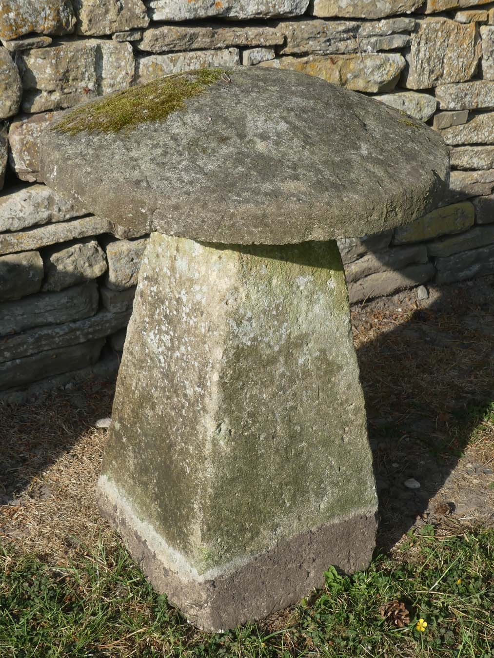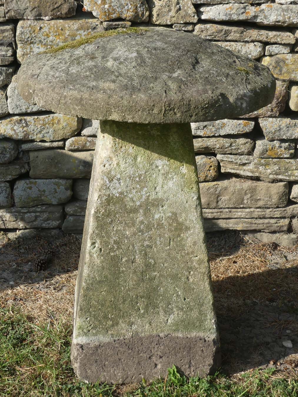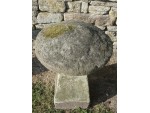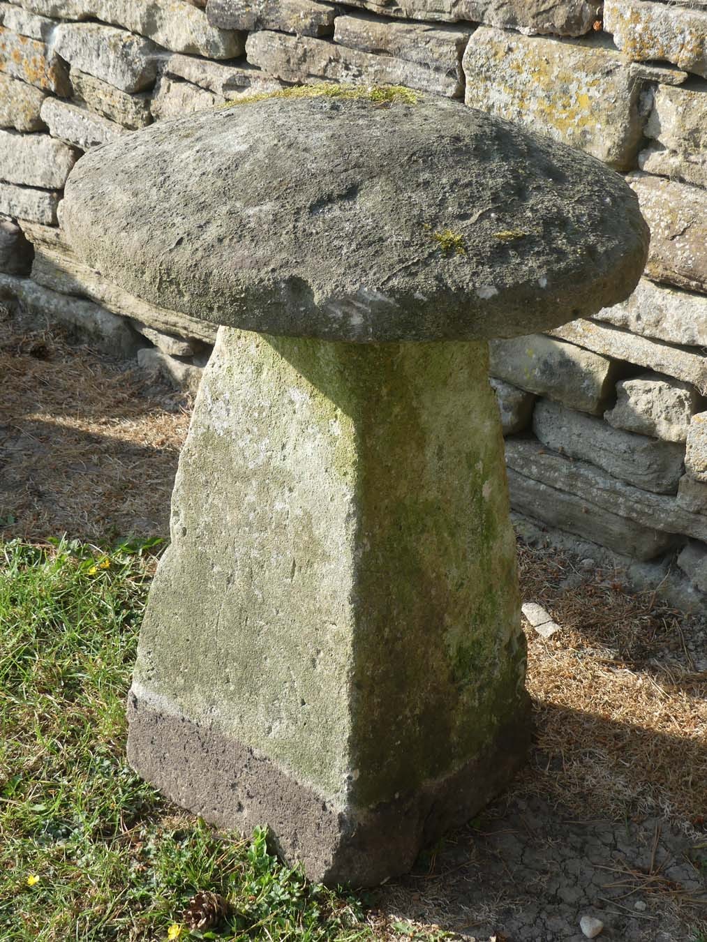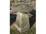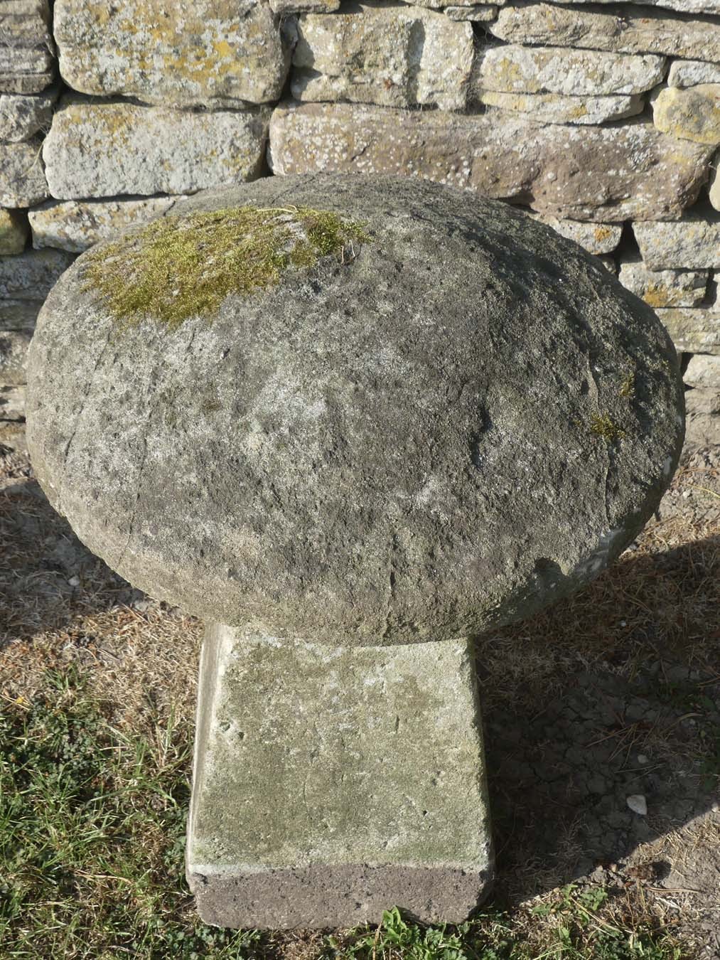 An antique limestone staddle stone from Berkshire, the weathered round top on a separate tapered square base.