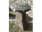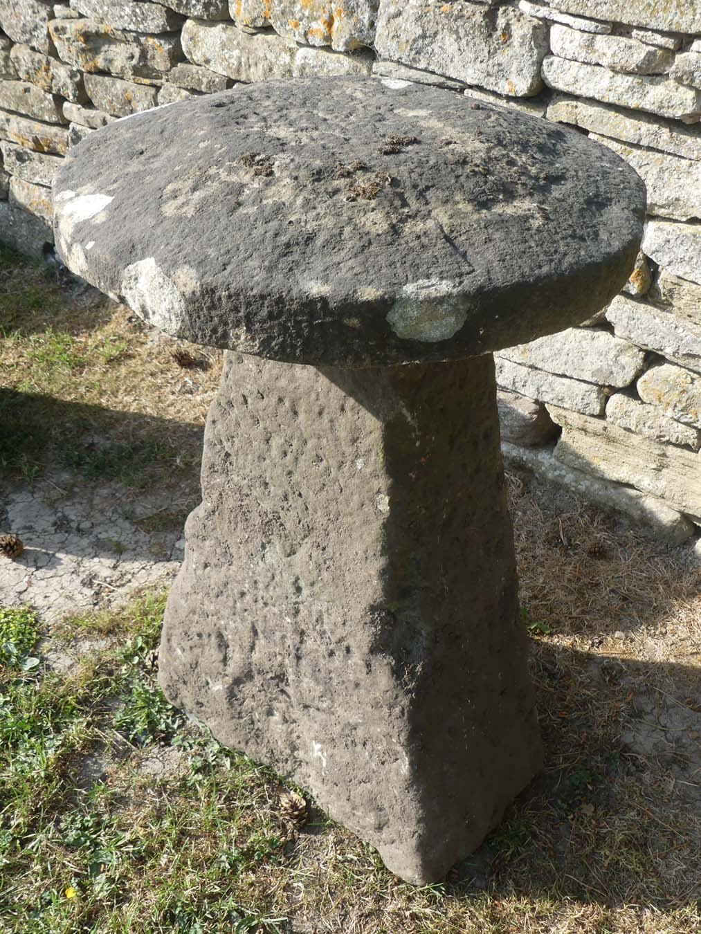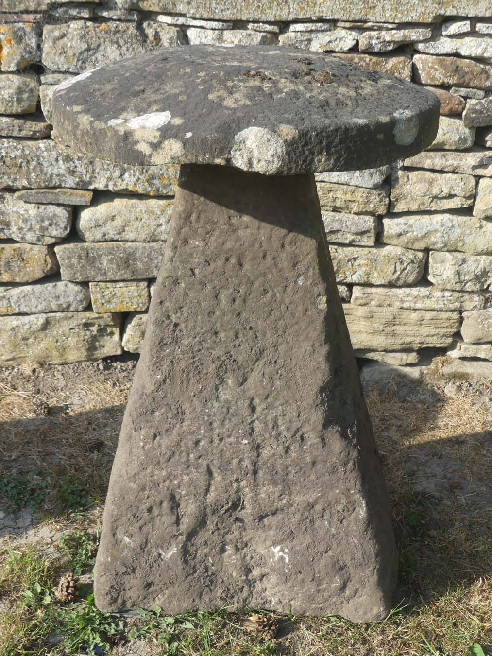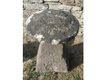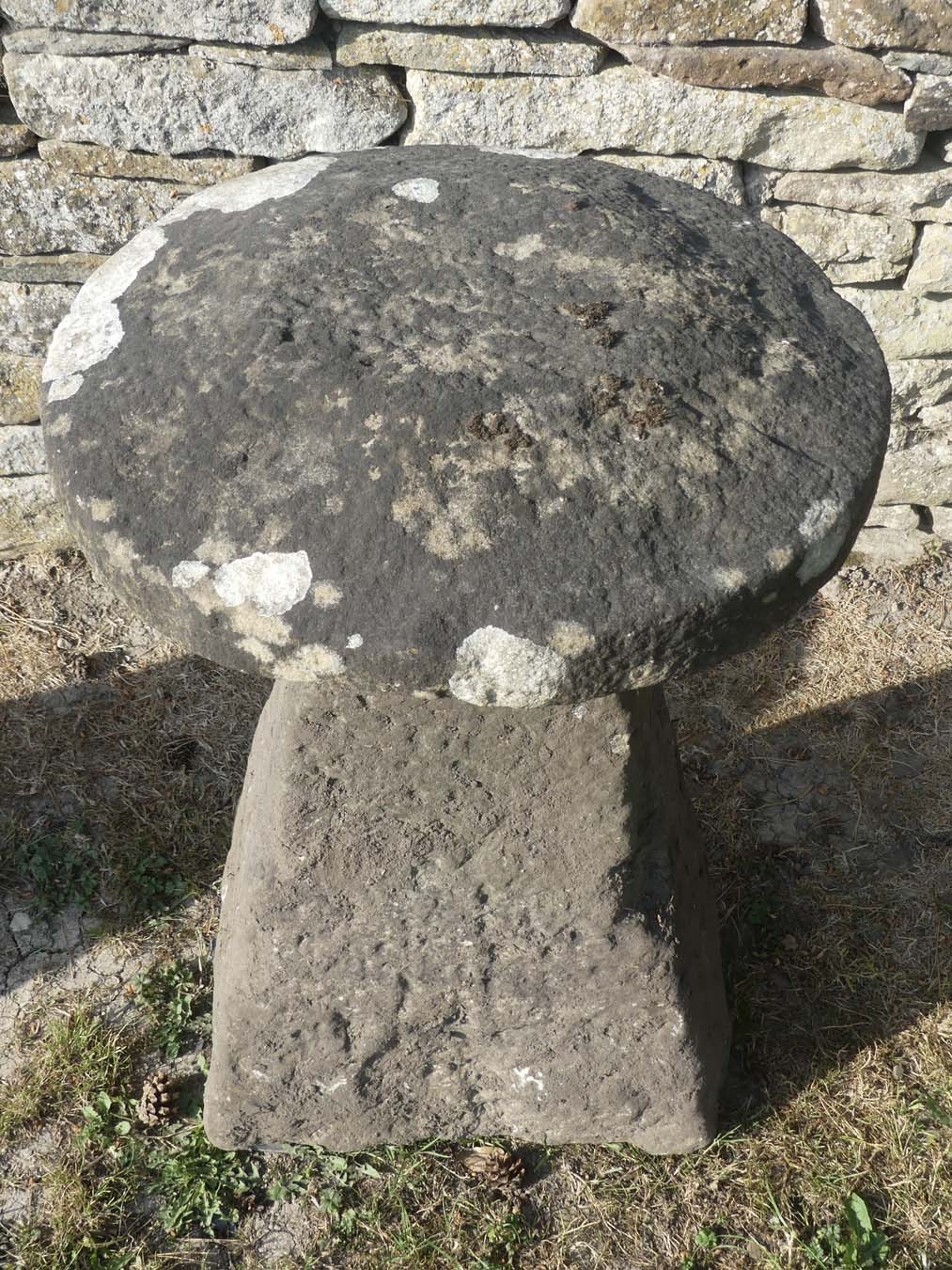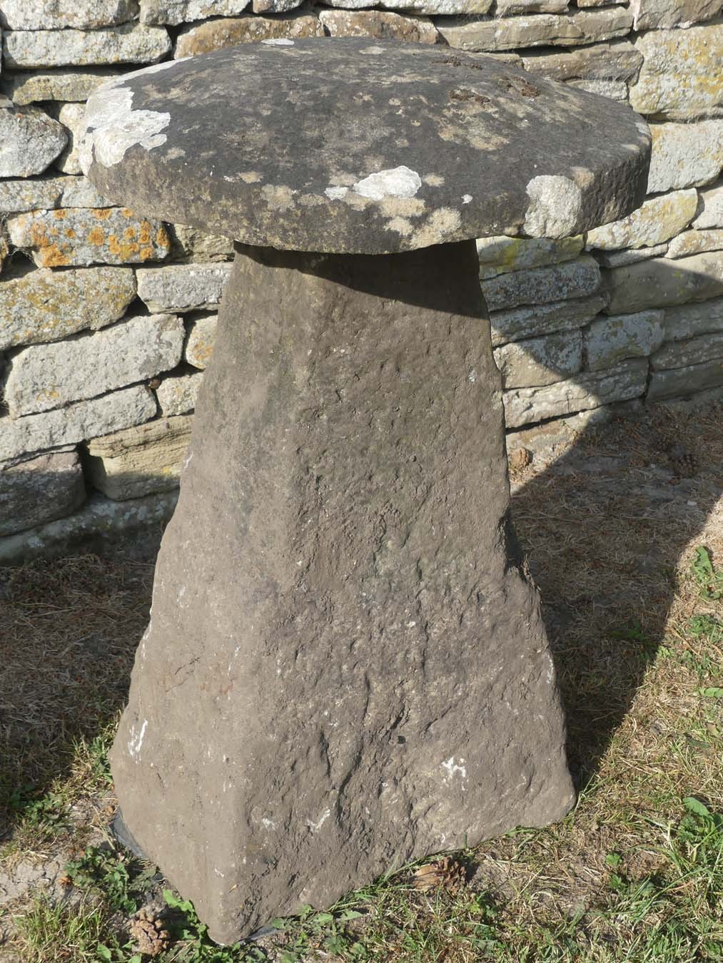 An antique limestone staddle stone from Berkshire, the weathered top on a separate tall tapered base.