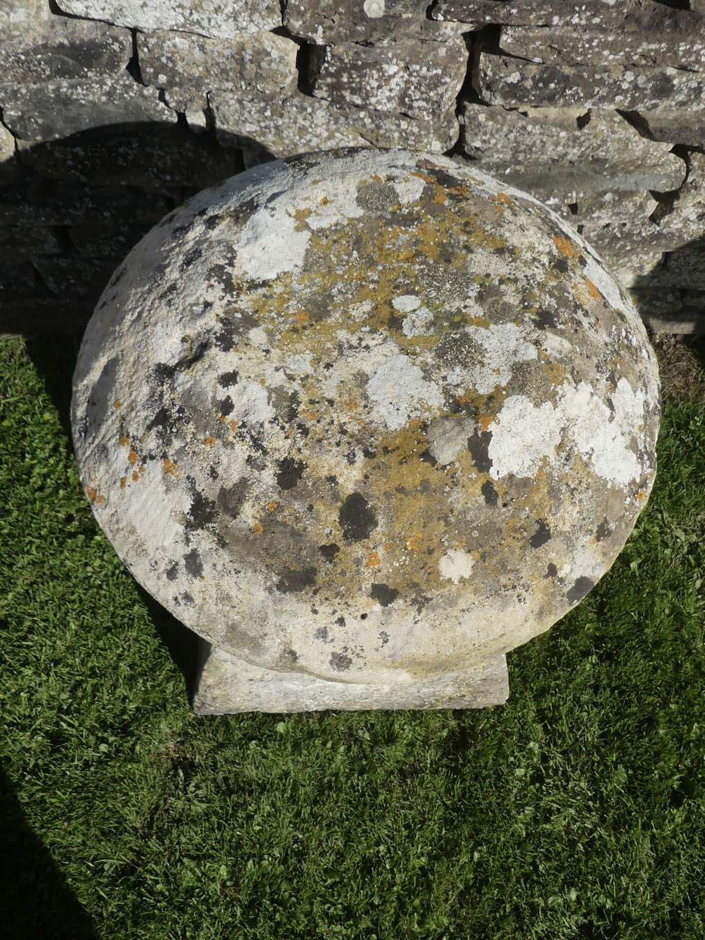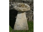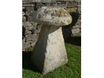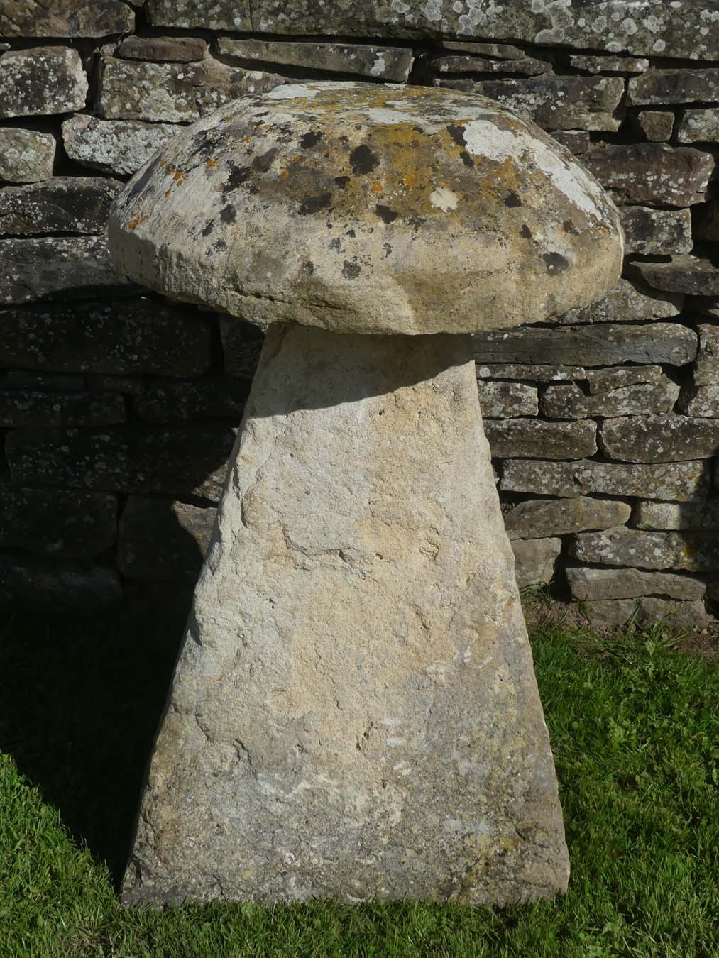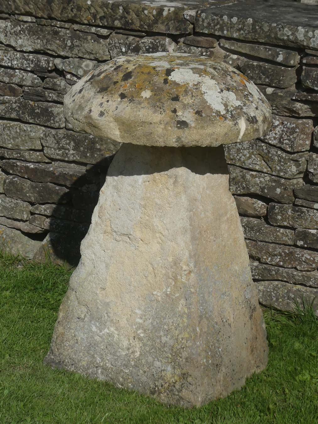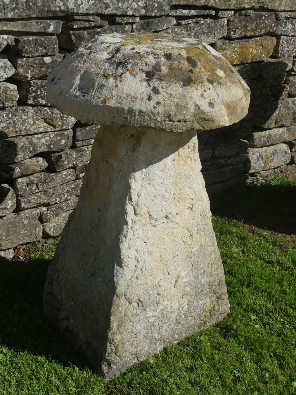 An antique limestone staddle stone with good height and an attractive weathered patination, the domed round top on a separate tapered rectangular base.