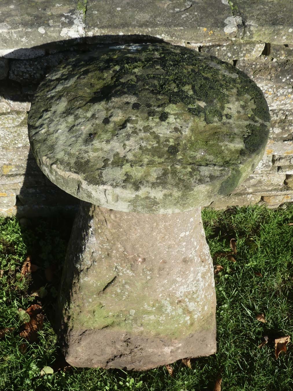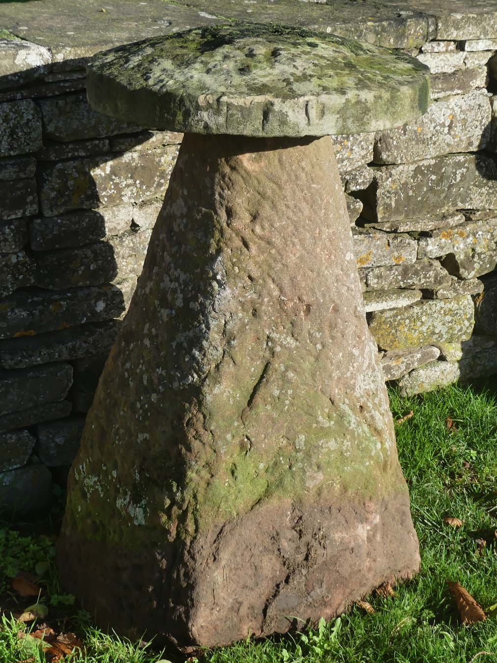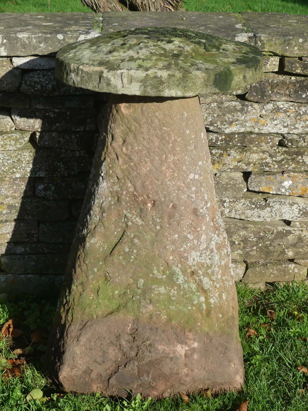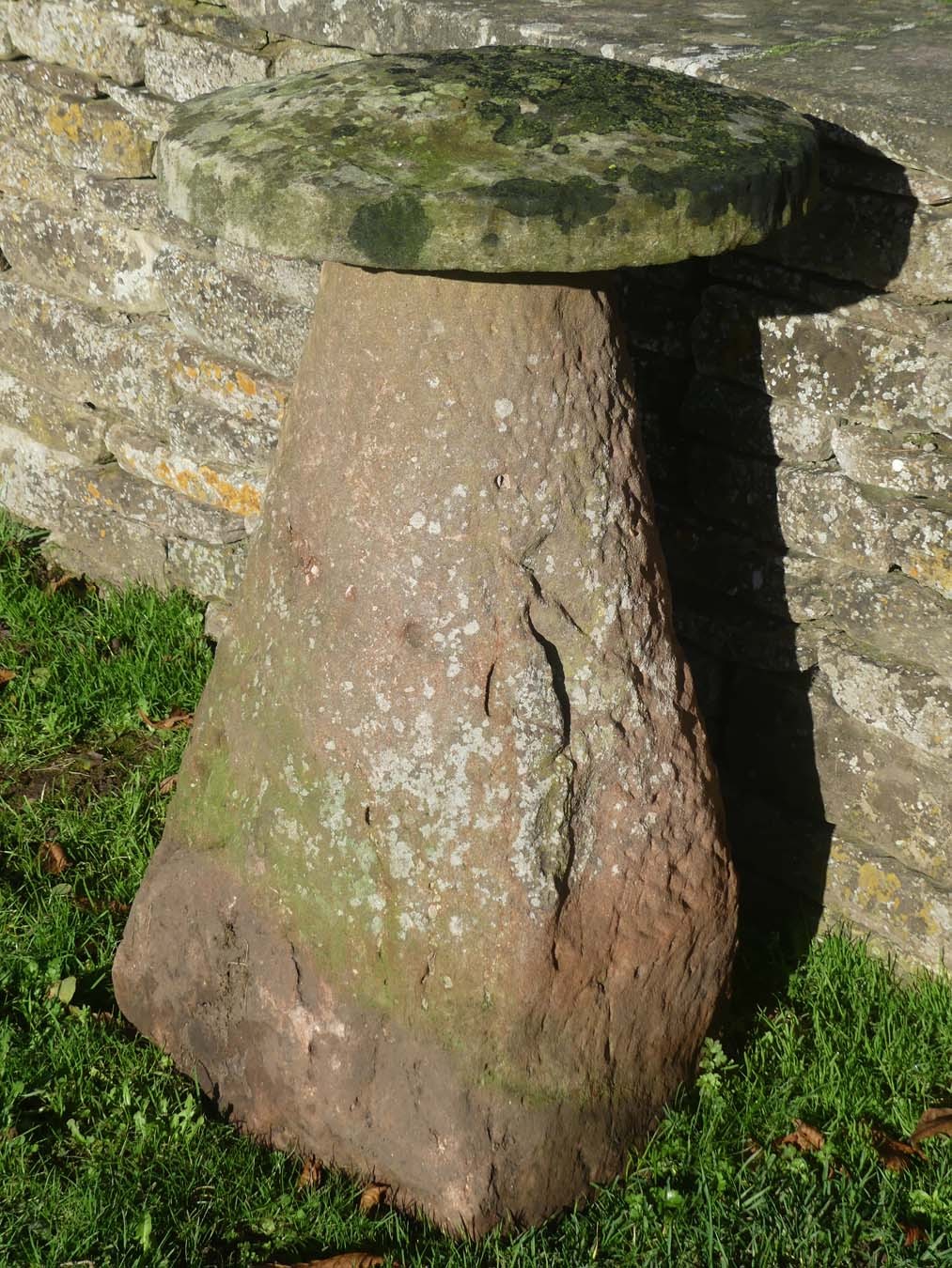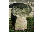 An antique sandstone tall staddlestone from Herefordshire, the round top on a substantial tapered base.