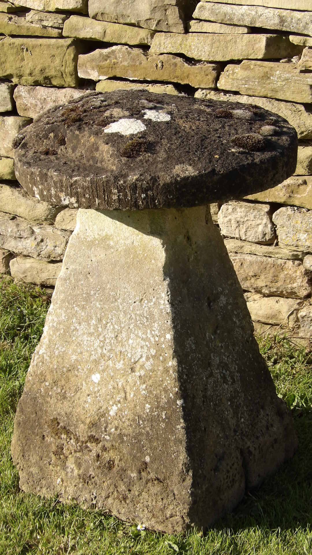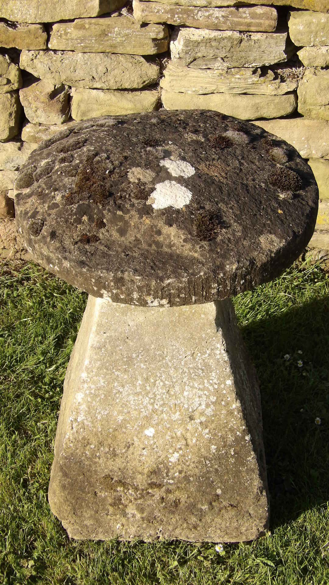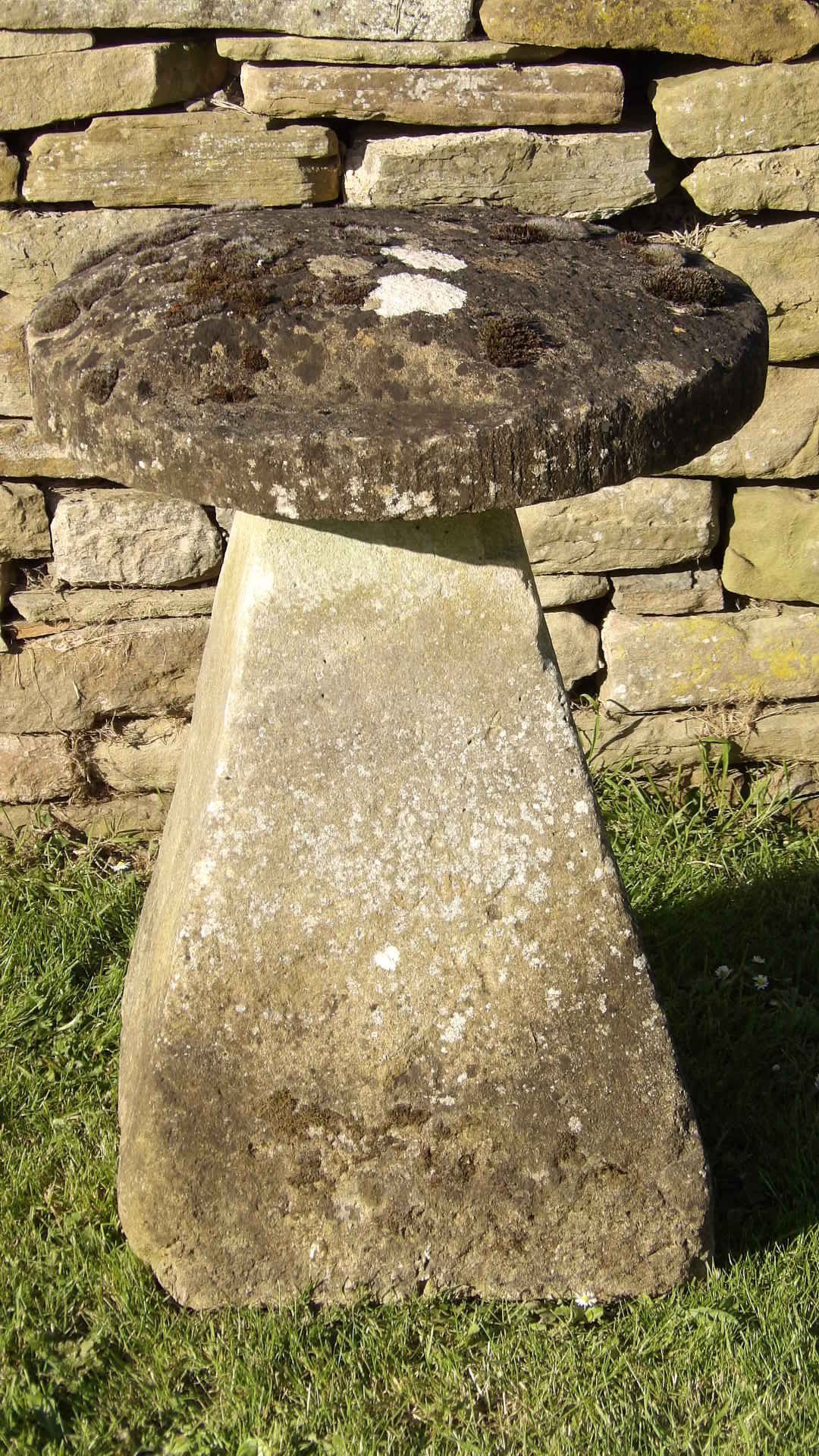 An antique limestone staddlestone of typical form with a well established colonisation of moss and lichen.