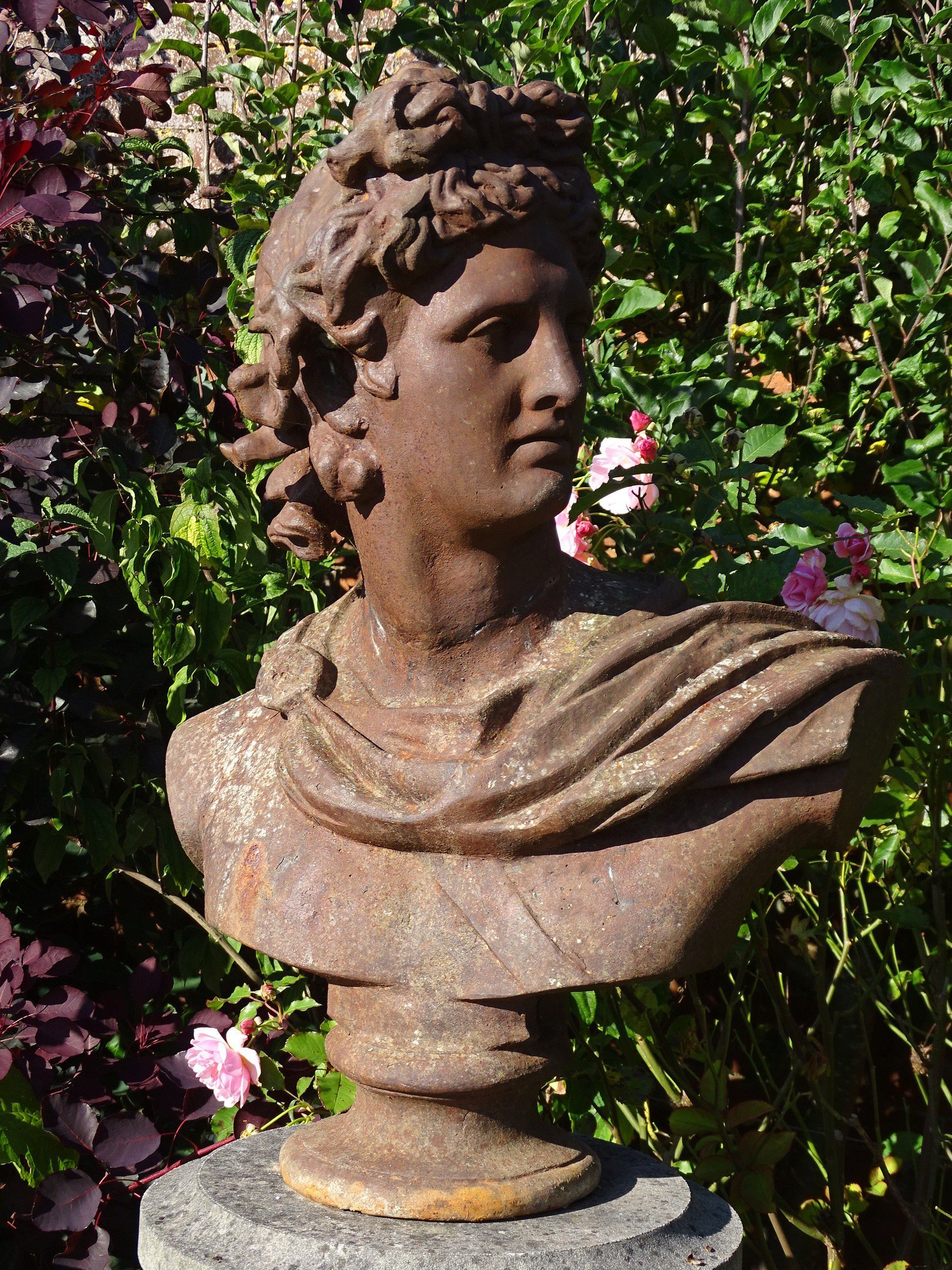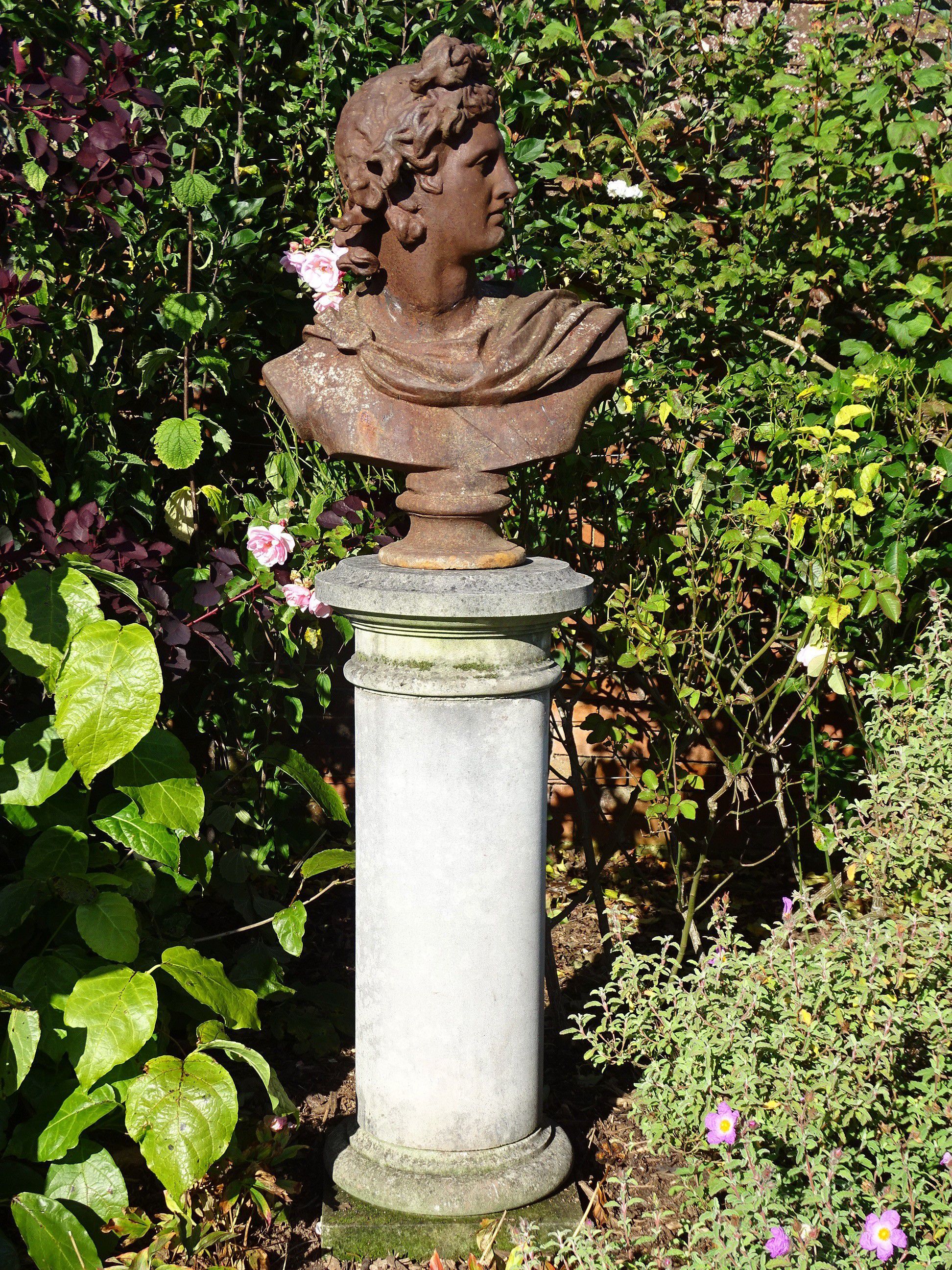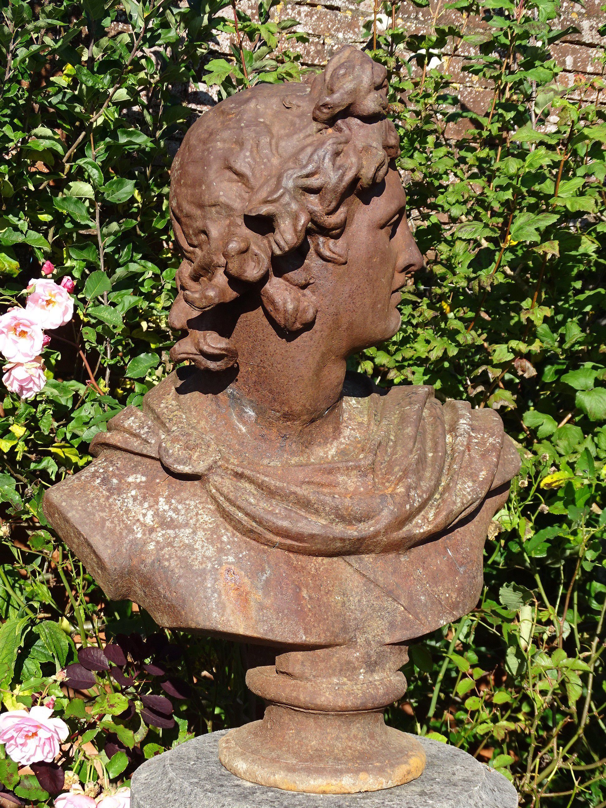 A vintage bust of the Apollo Belvedere on an associated modern composition stone column. Unusually made from cast iron this is a large scale bust with an attractive weathered patination.