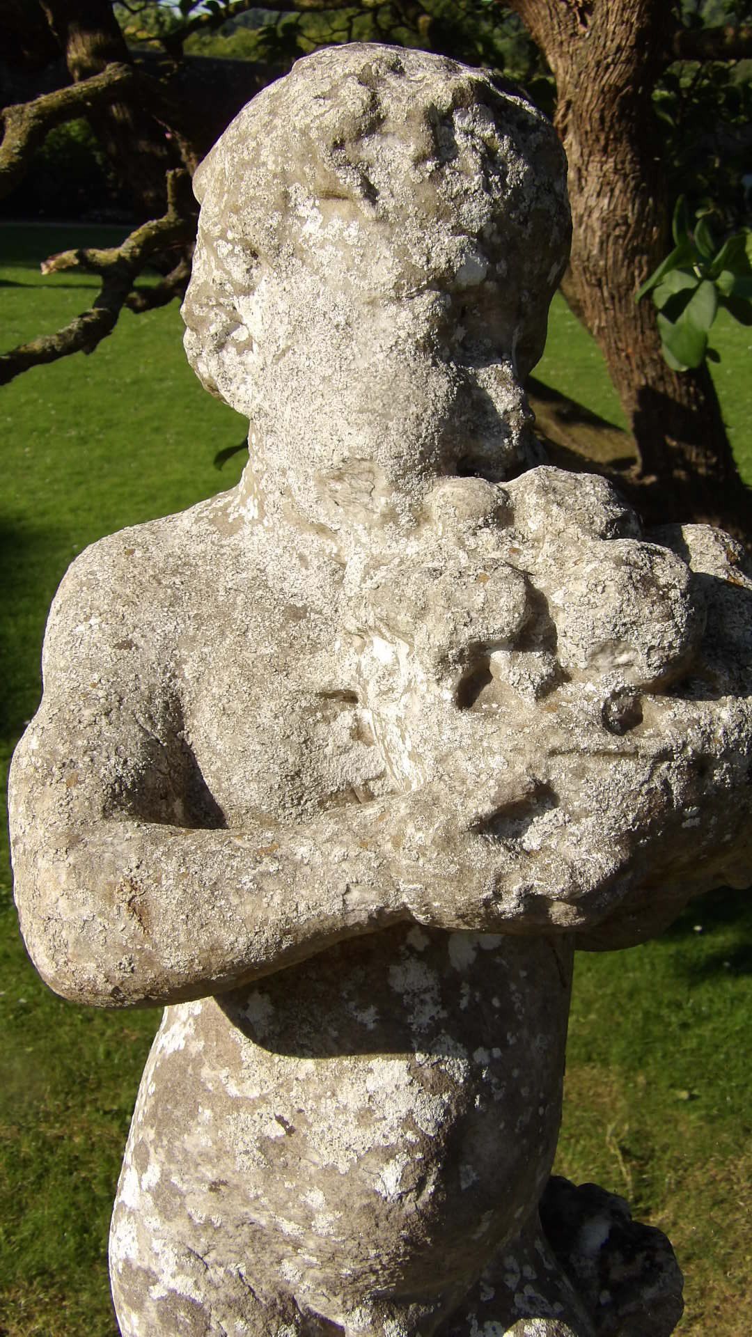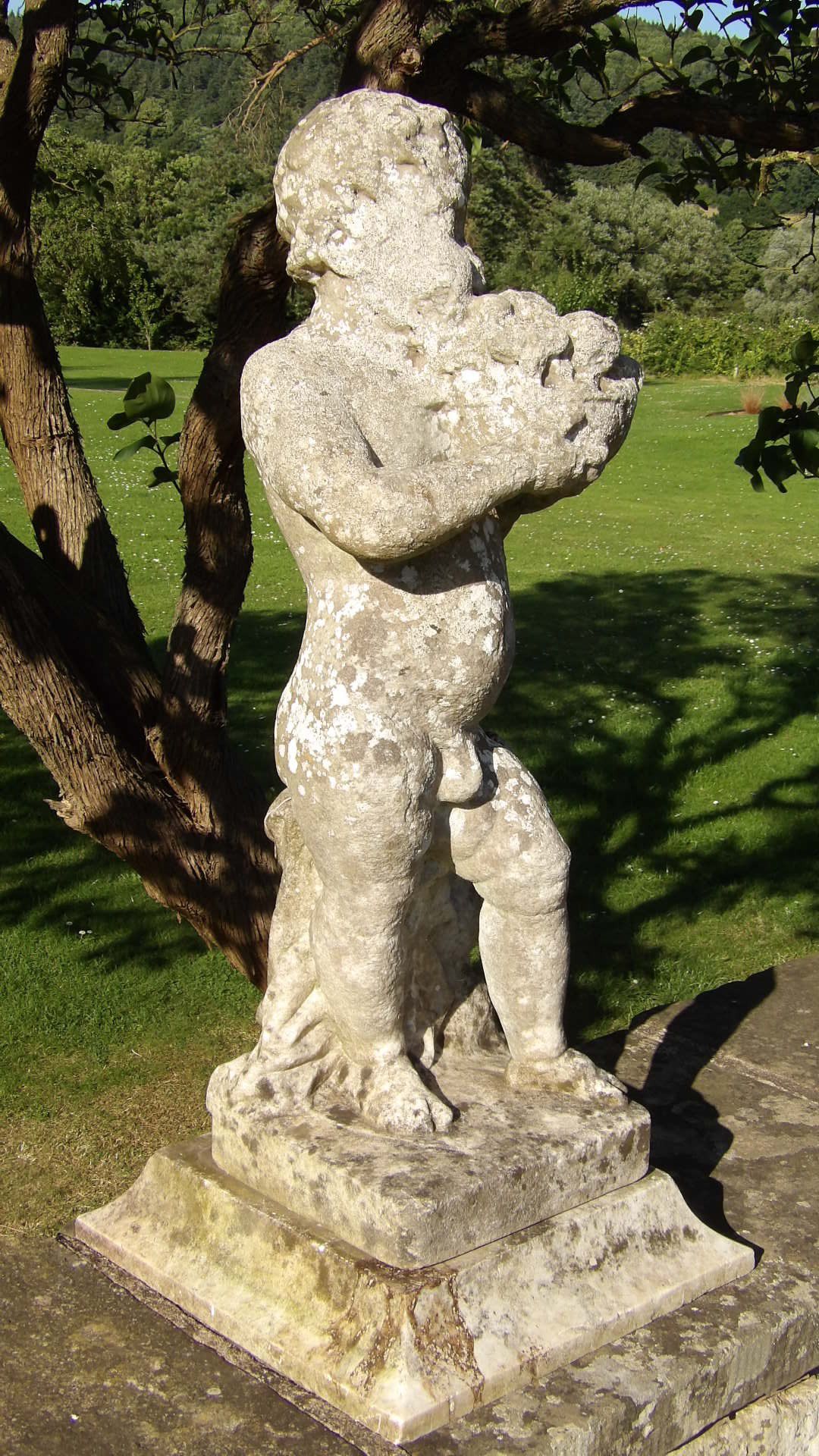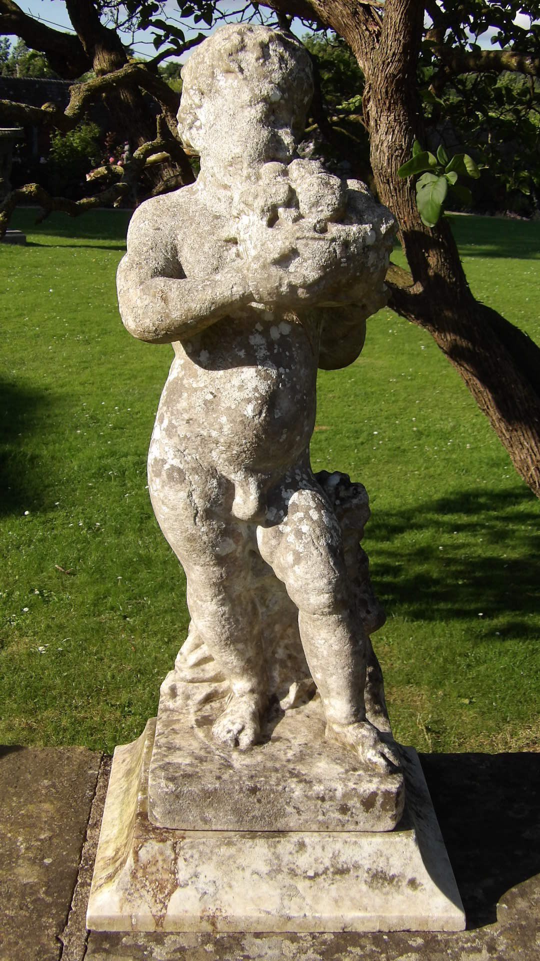 An antique marble putto, standing naked next to a rocky outcrop and holding a basket of fruit, on a tapered square bale. This is a rare garden statue which might be quite early and retains its main features despite being heavily weathered. Carved puttos were popular subjects in early formal gardens, most of which disappeared when the fashion for English 'landscape parks' took hold in the second half of the eighteenth century.