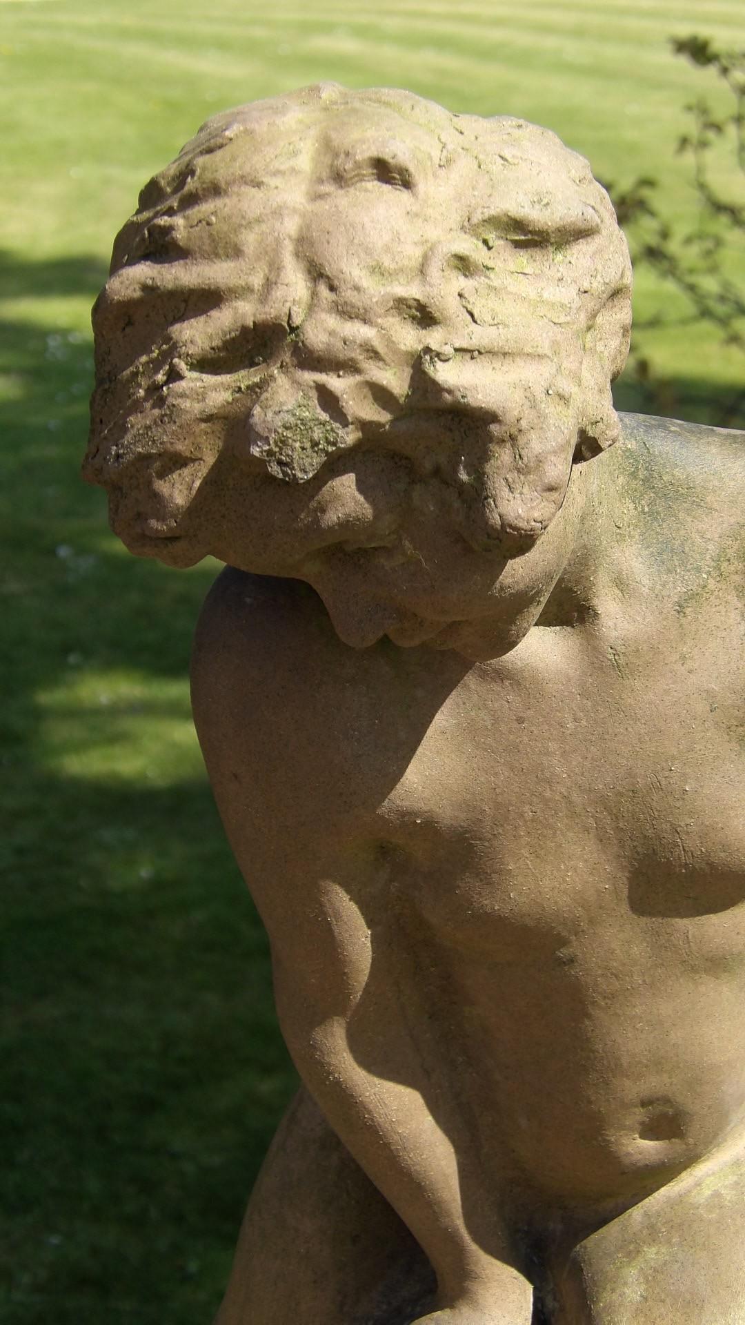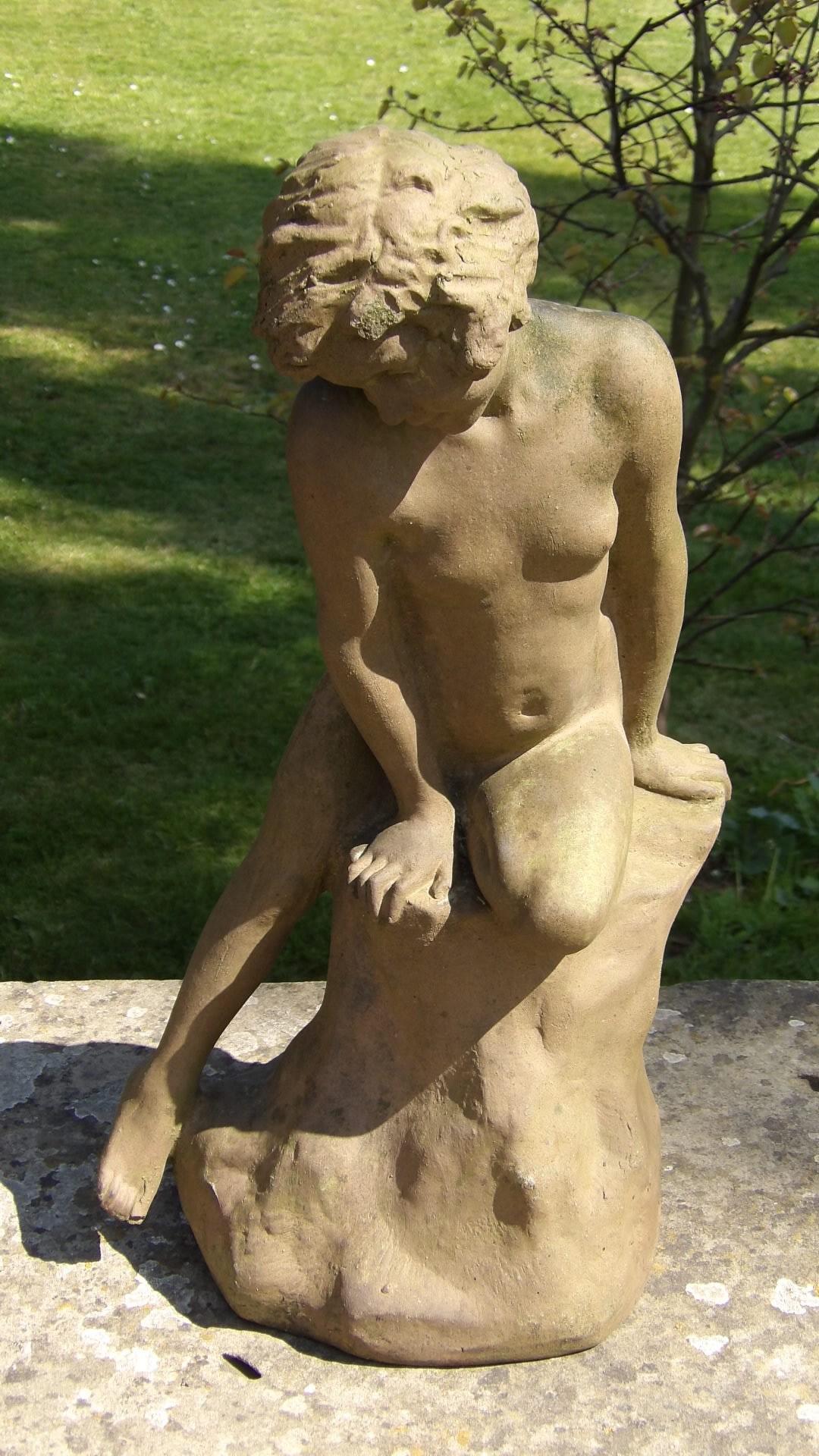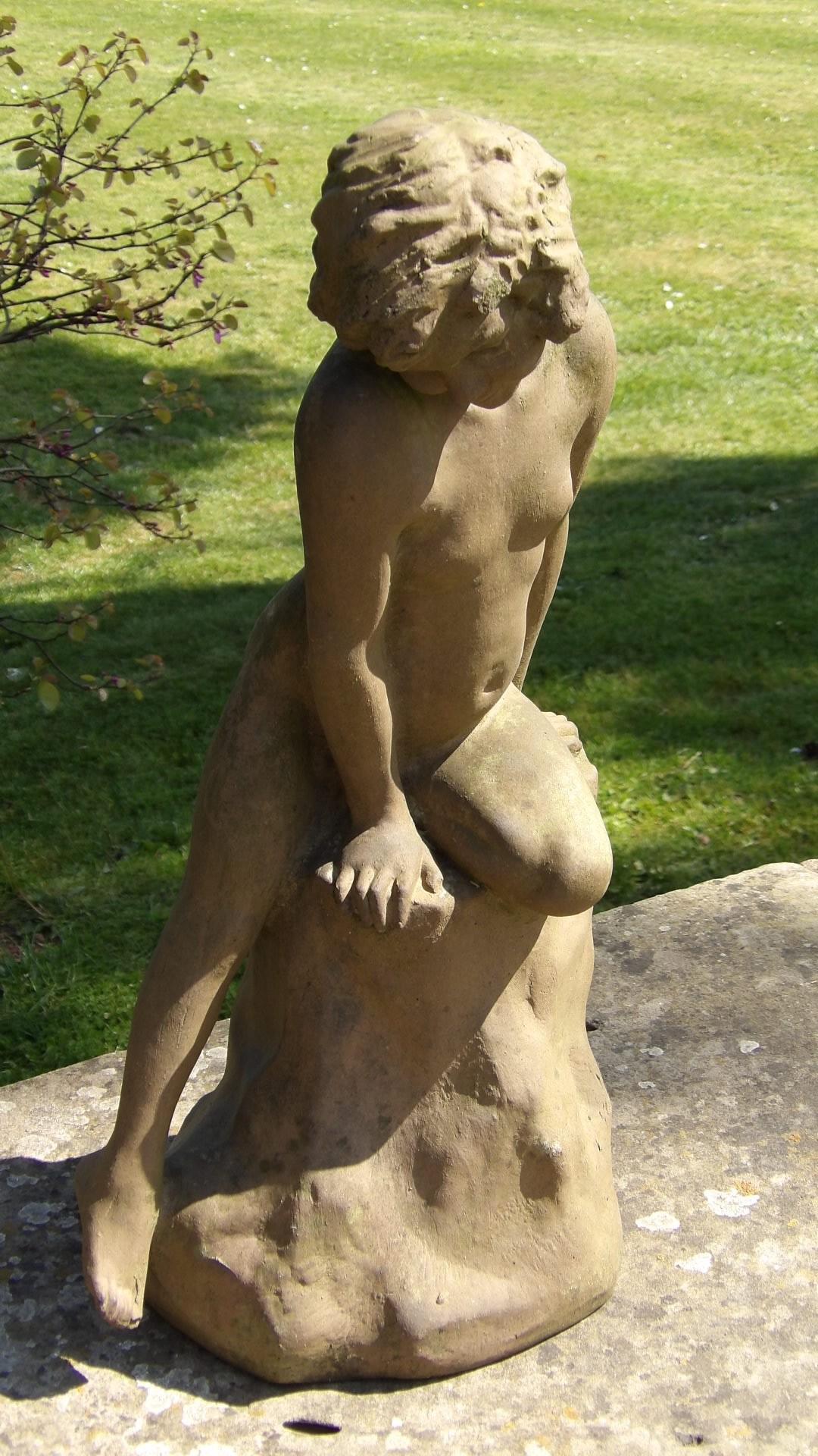 A vintage garden statue of a young girl sitting on a rocky outcrop looking down. Stamped 'Doulton' underneath this is one of a small range of terracotta garden figures produced by the company early in the 20th century. It is a well modelled figure and would look charming in the right location, perhaps looking into water.