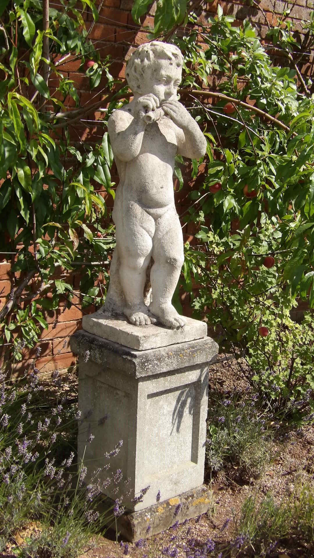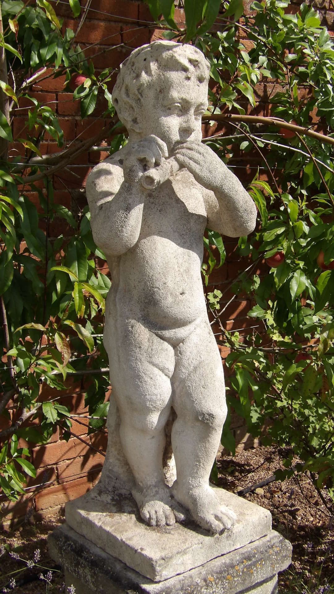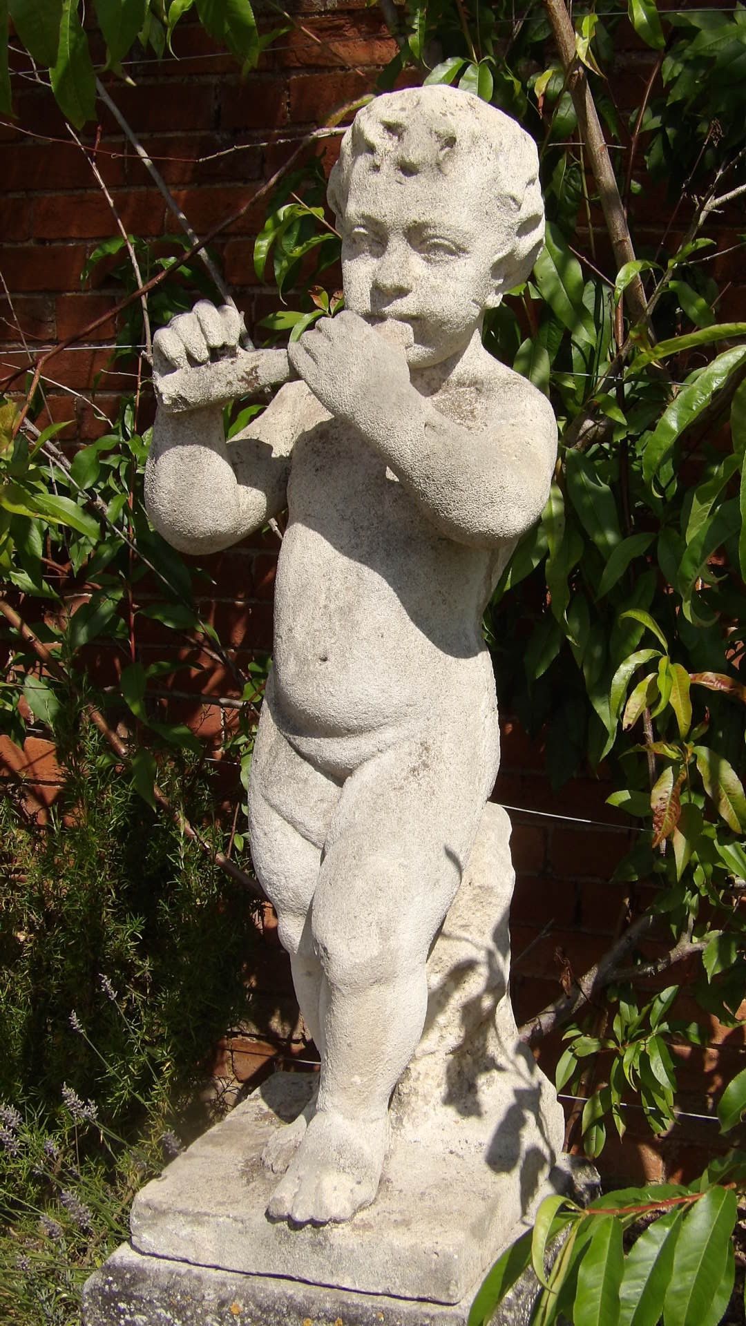 A carved limestone garden statue of a standing putto playing a pipe. Almost certainly Italian, the subject of a putto (or cherub) playing a musical instrument has long been a popular theme in garden decoration. The figure is older than it looks and the lack of a weathered patination probably means it has been recently cleaned or has been kept inside.