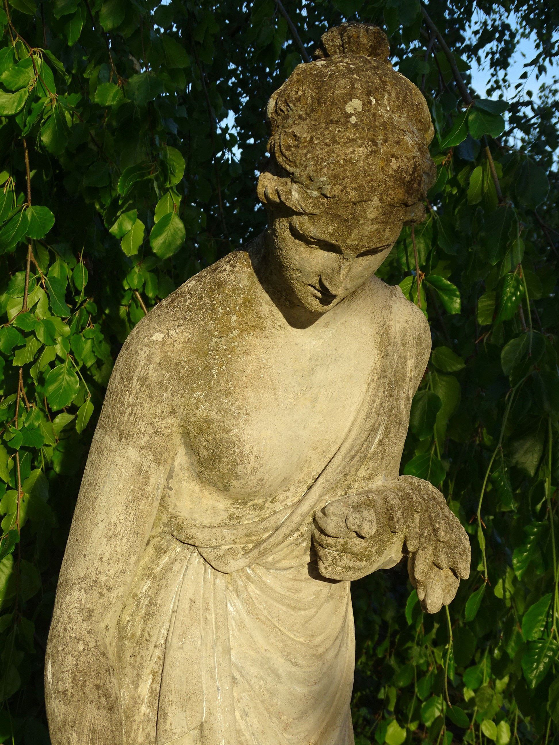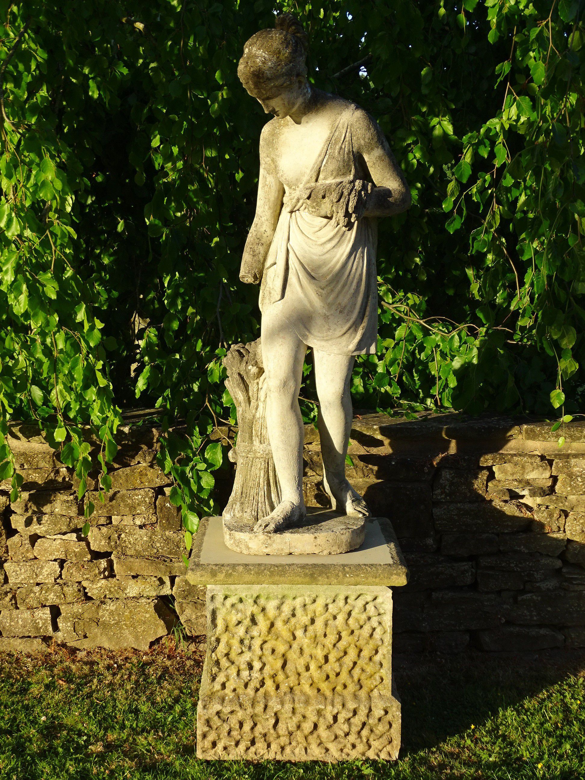 A composition stone figure of Autumn from the renowned London workshop formed around 1840 by Felix Austin and John Seeley. Felix Austin pioneered the development in the early 19th century of good quality garden statuary in 'artificial stone', much of which survives today in remarkably good condition. This is Autumn from Austin and Seeley's set of four seasons depicted in an advert of 1858 and is missing it's right hand and lower arm. It was formerly painted silver, perhaps to look like lead, but only traces of this remain and the inherent quality of the statue is evident especially around the head and face.