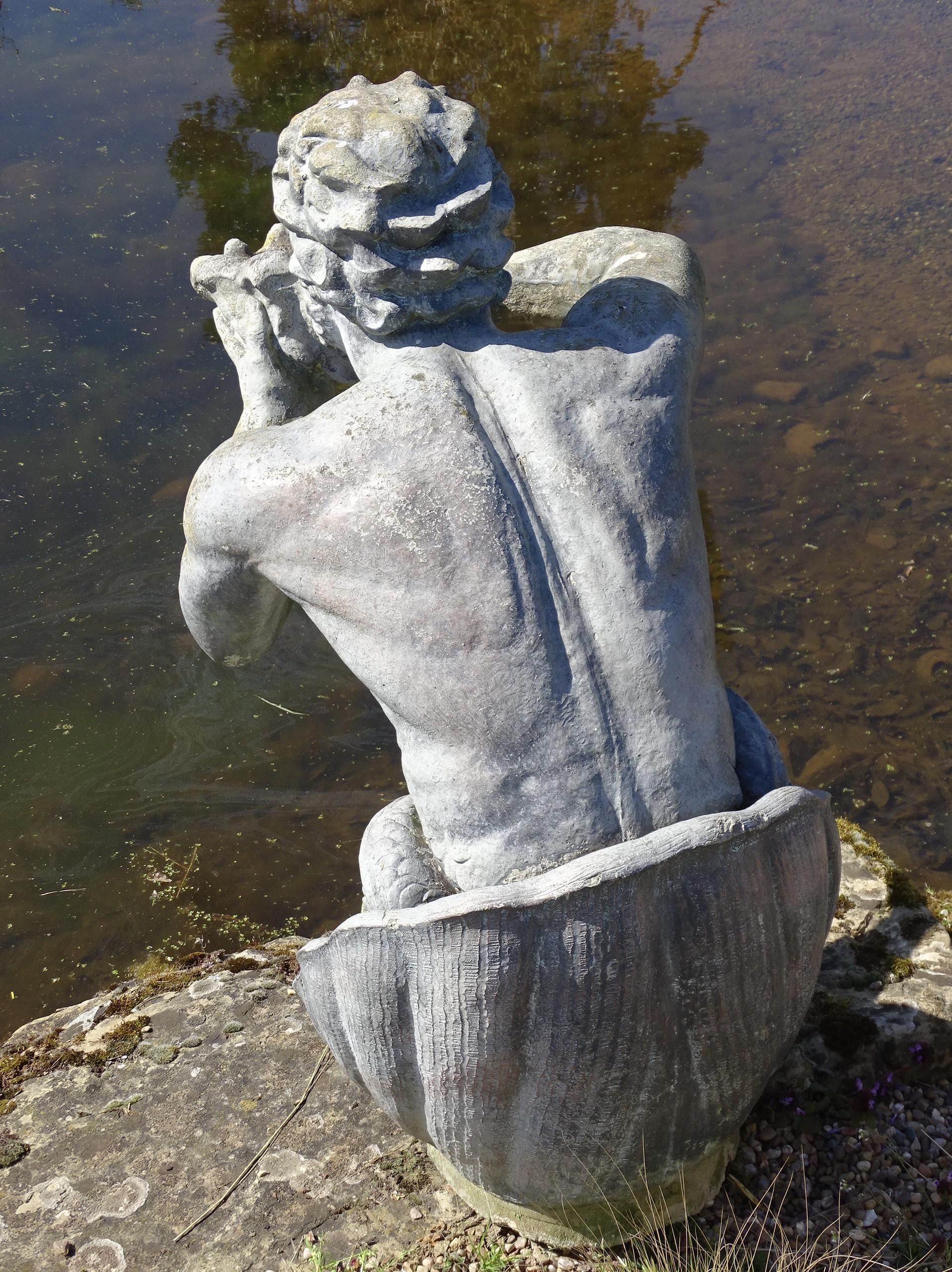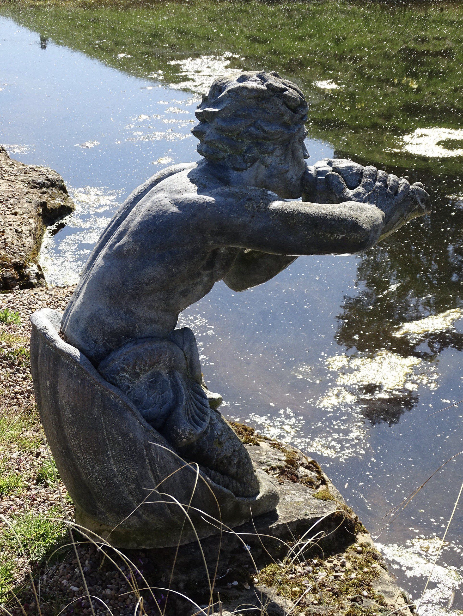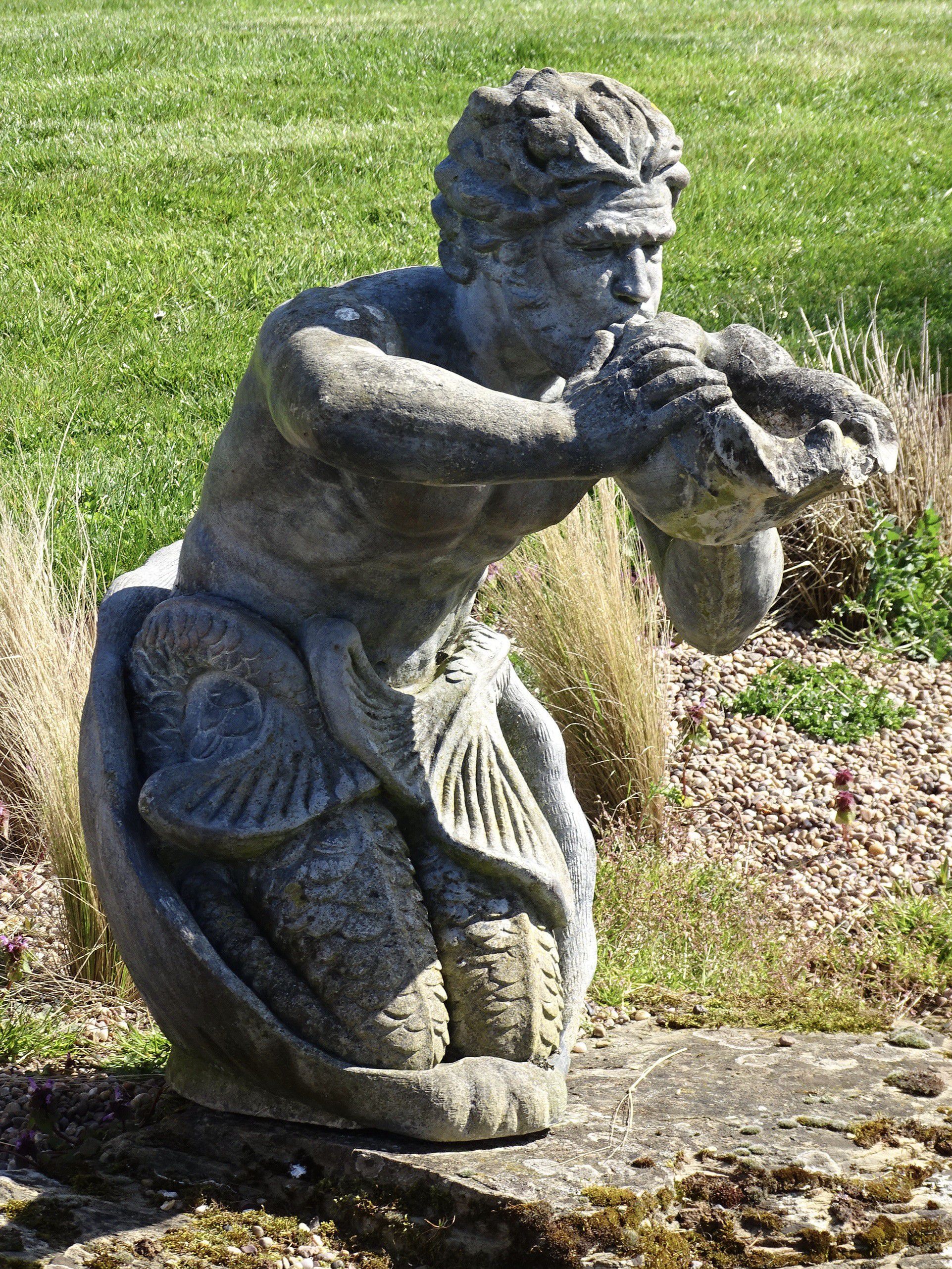A large composition stone statue of a merman blowing on a conch shell with his two tails curled around his waist.