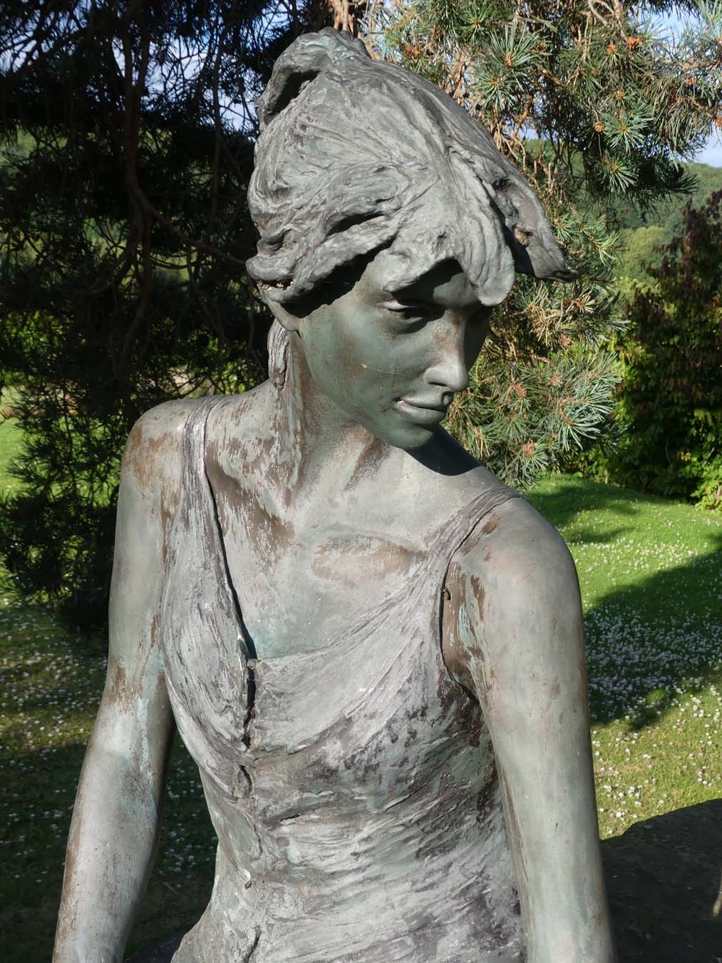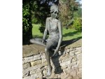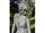 The figure now has a muted verdigris patination after many years exposed to the elements and is sold together with a square bluestone plinth which is included if required and allows the sculpture to free stand in any location. The bluestone plinth is not photographed but the dimensions are 16" x 16" x 24" high.