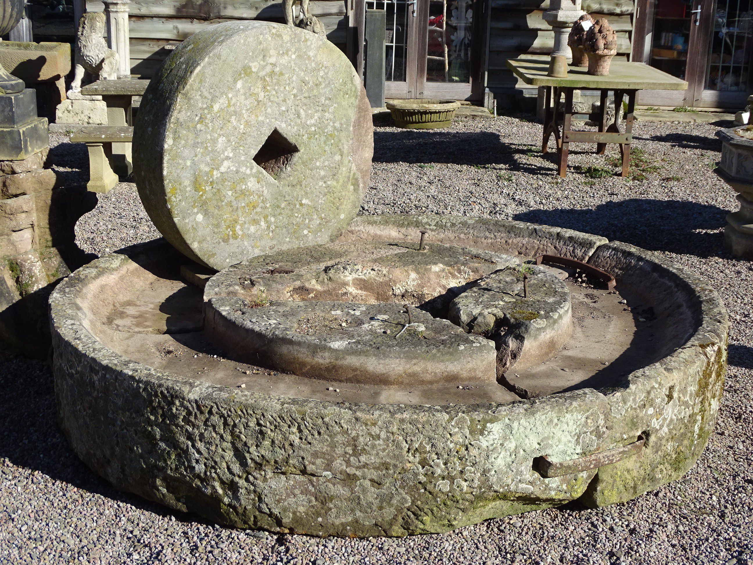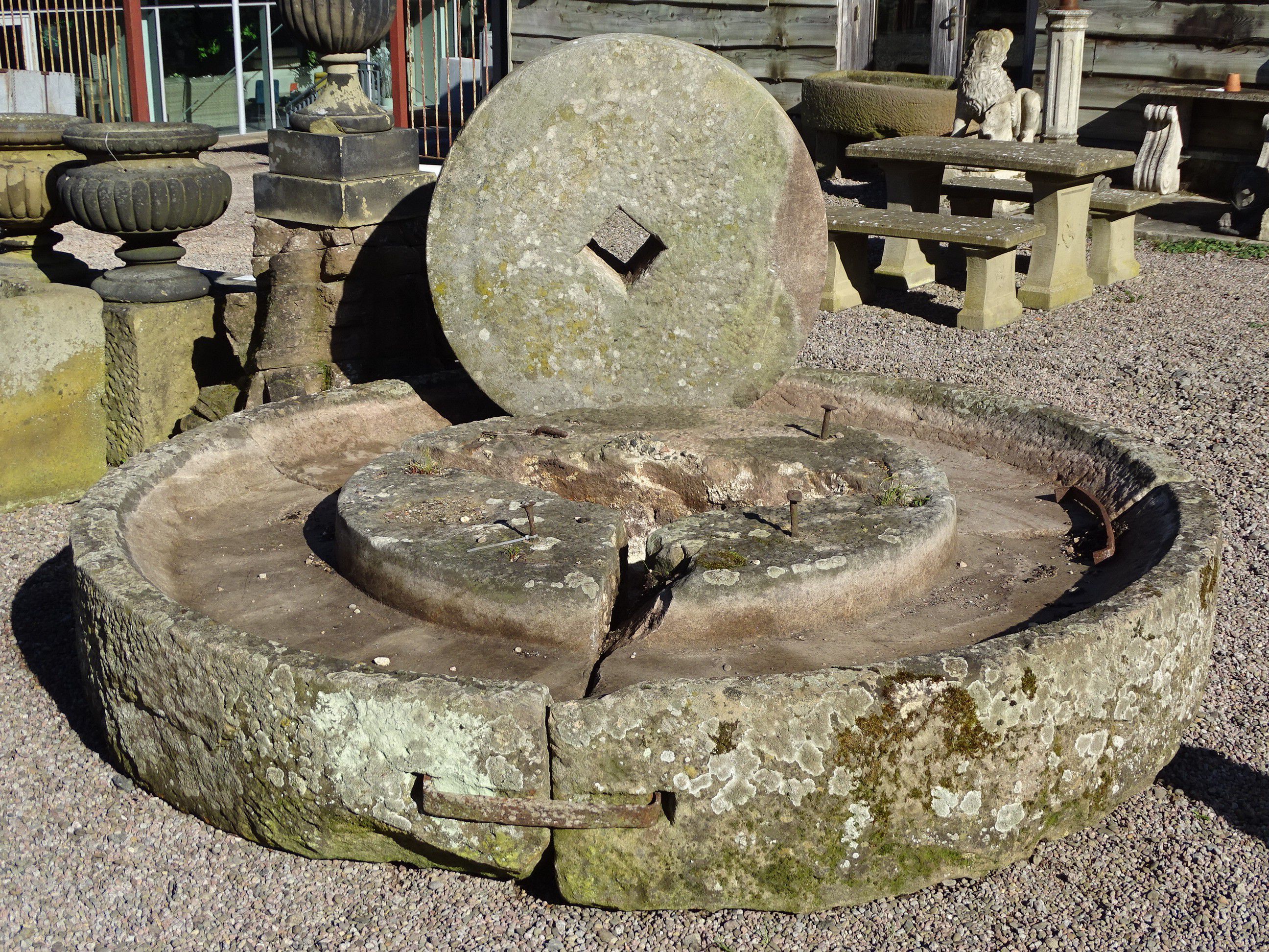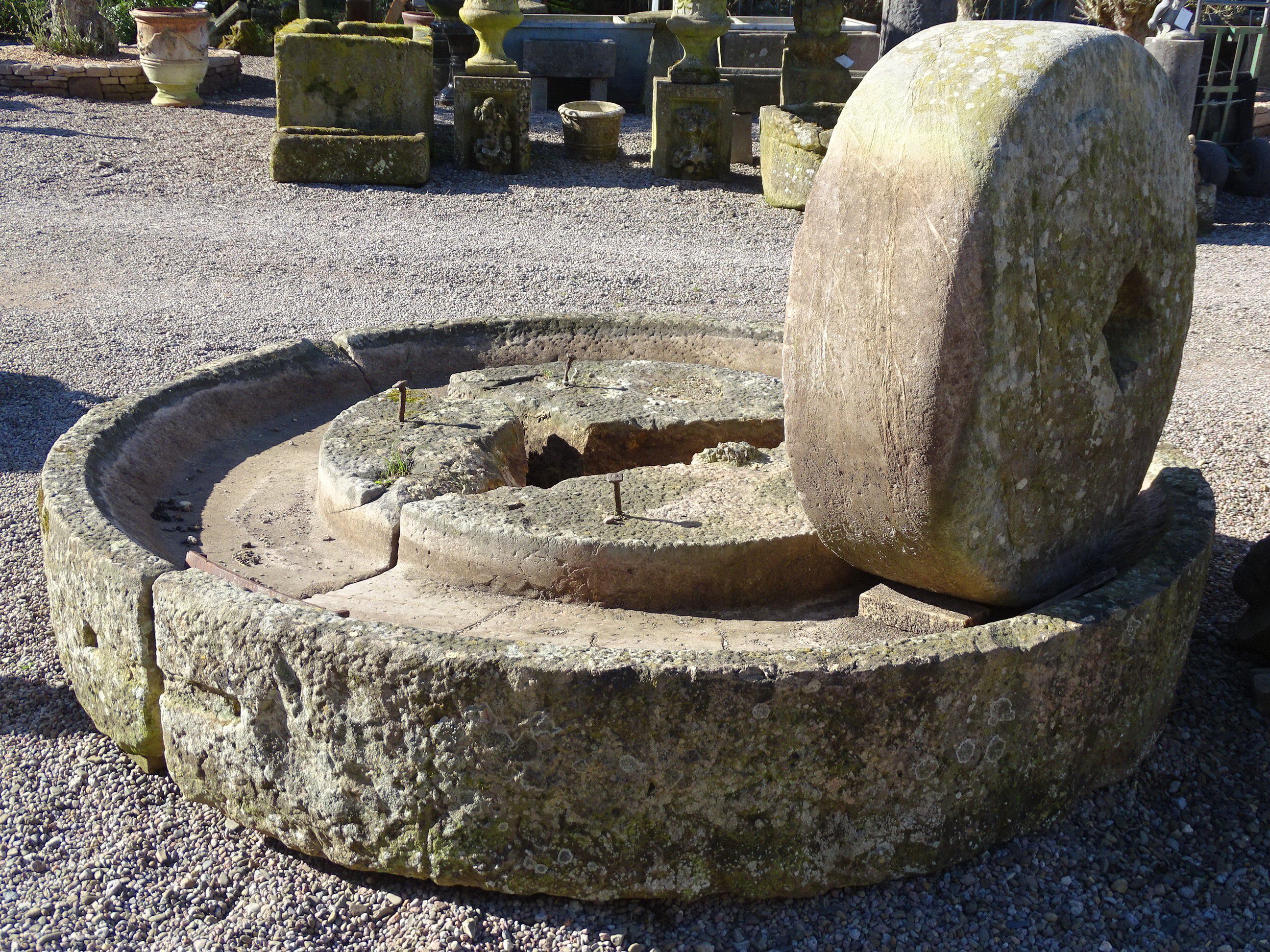 An antique cider mill from Gloucestershire with its original roller stone, the base carved in three parts. This is a particularly good stone cider mill with good proportions and in generally good condition. It reputedly originally came from the village of Gotherington, near Cheltenham.