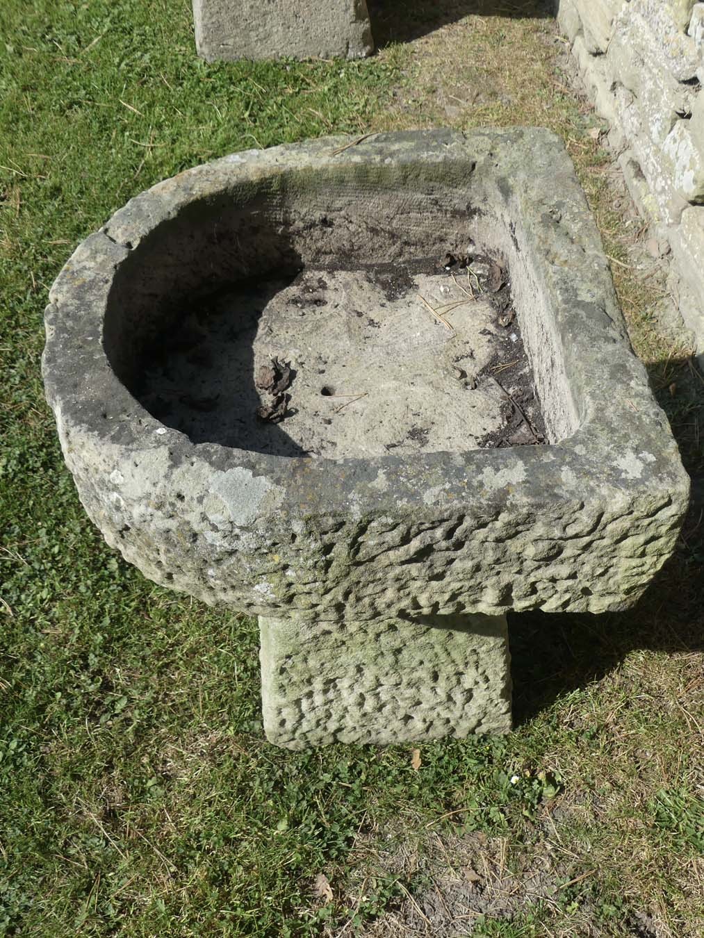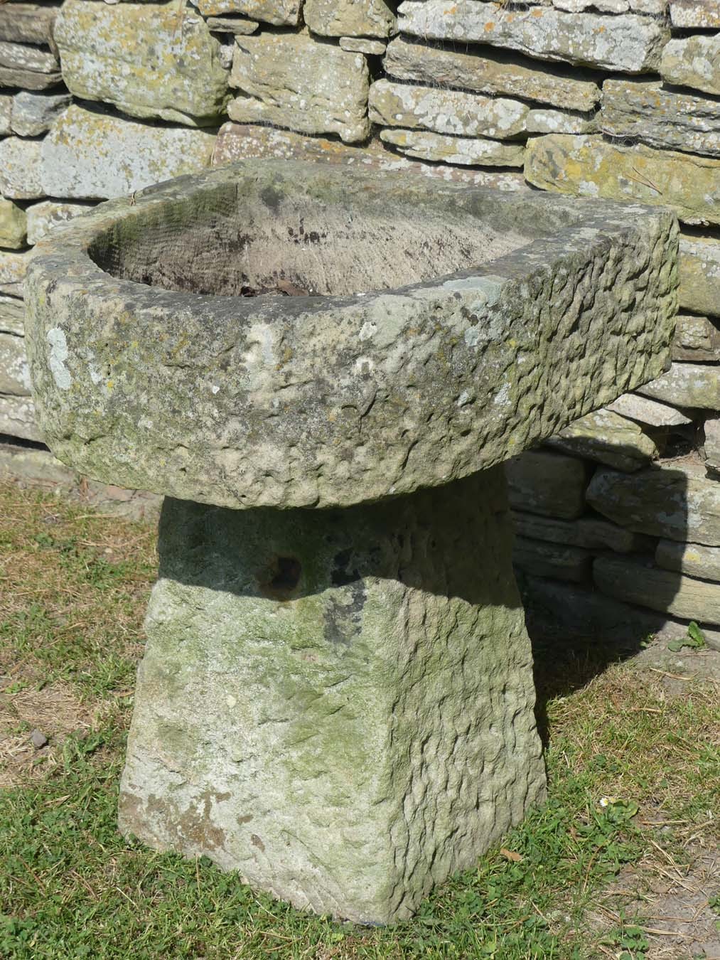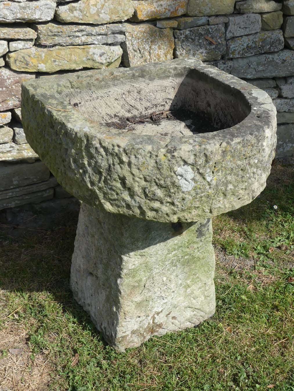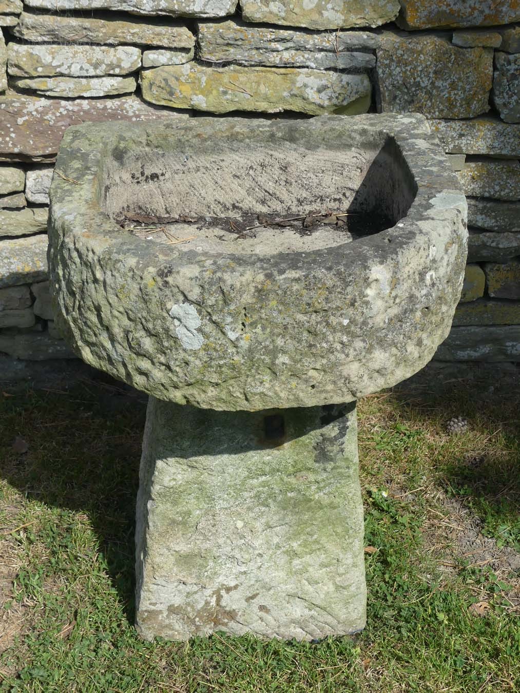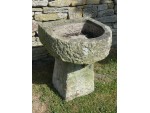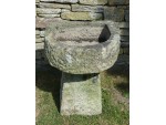 An antique sandstone trough from Shropshire on a separate matching tapered stone base. The trough has a bowed front with a well weathered surface patination but, unusually, shows signs of having been hollowed out with a core drill then hand finished with a chisel.
