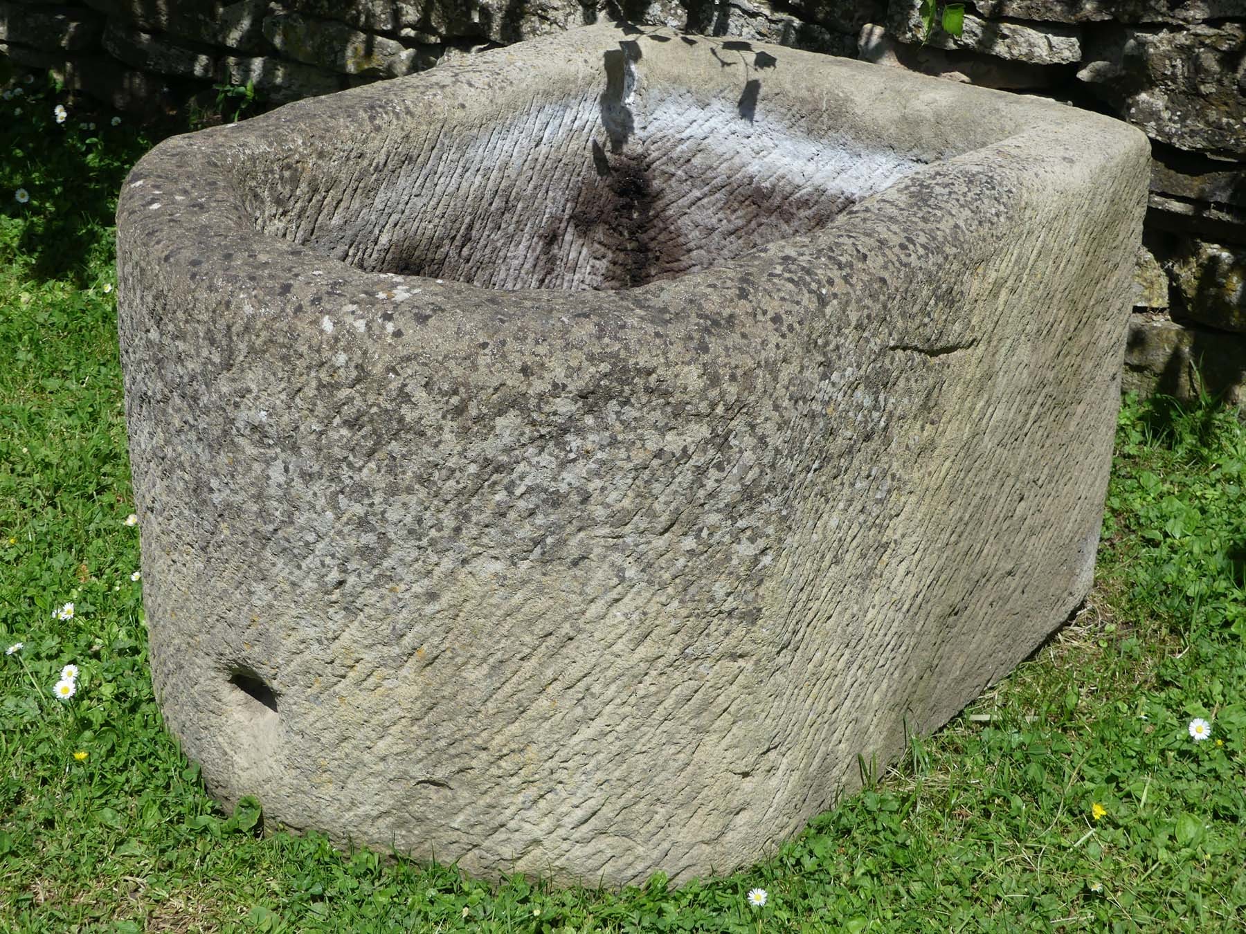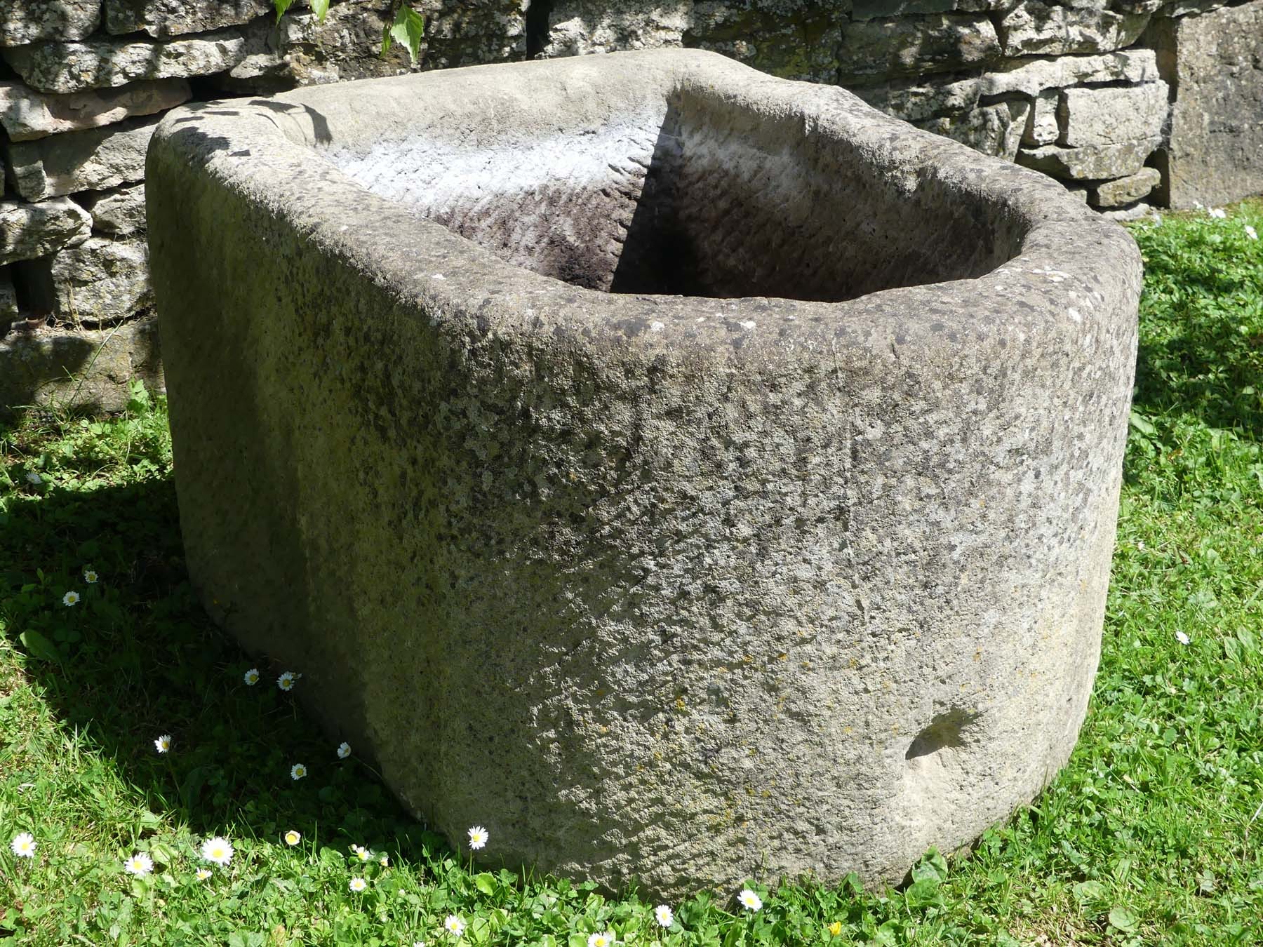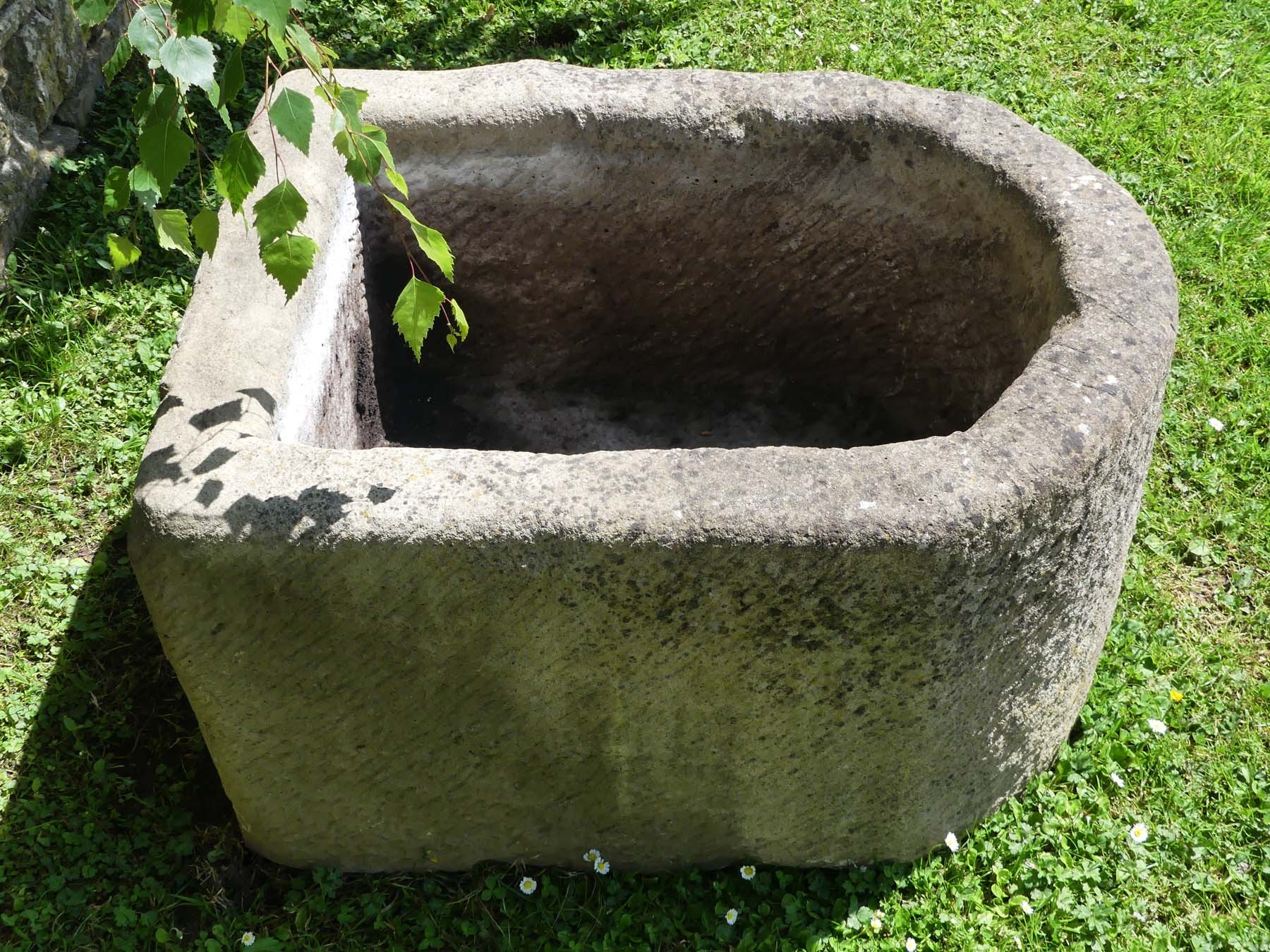 An unusually large D-end trough made from composition stone, the rounded front with a central drainage hole and also with a drainage hole through the base. This trough has begun to develop a weathered look and is great value for a planter of this size and shape.