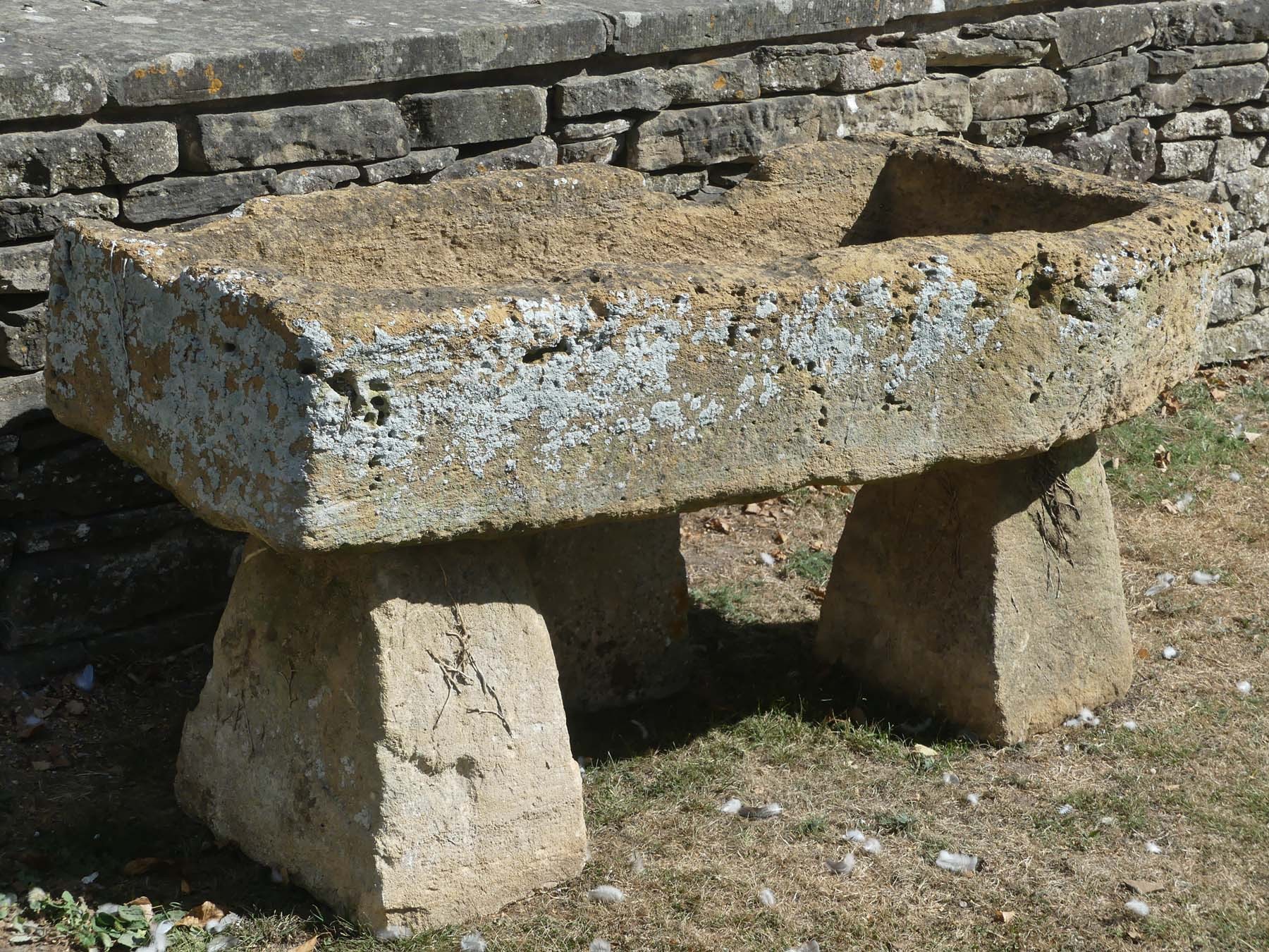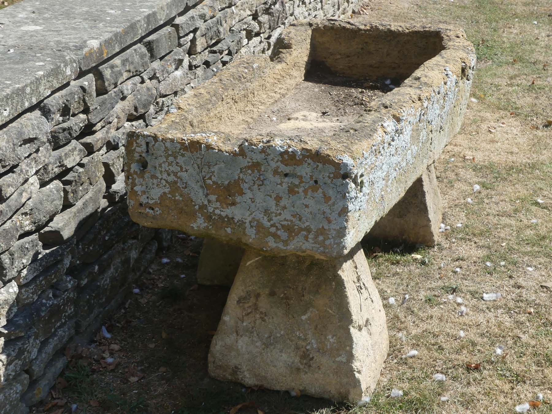 A large limestone trough from the Cotswolds, Gloucestershire, asymmetrically shaped and raised on three tapered staddle bases. There is a drainage hole through the base in one corner and it could become a self contained rock garden with plenty of space for bulbs and alpines. This is a large and heavy trough and we are happy to assist with delivery and setting up.