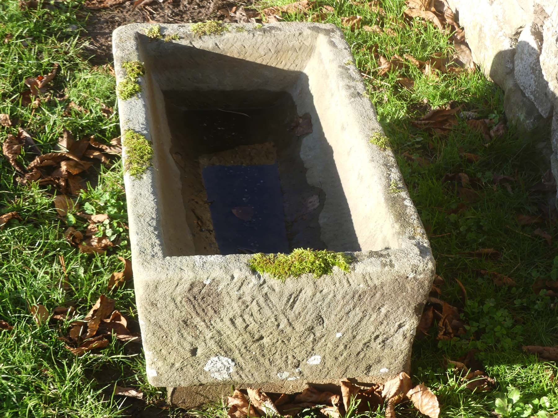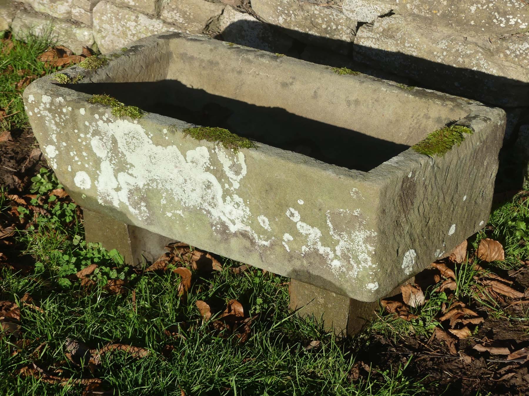 An antique sandstone rectangular pig trough from West Gloucestershire on two matching stone blocks. The height given includes the stone blocks.