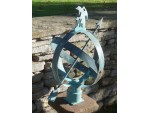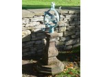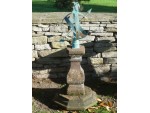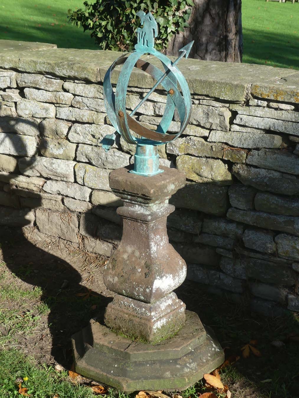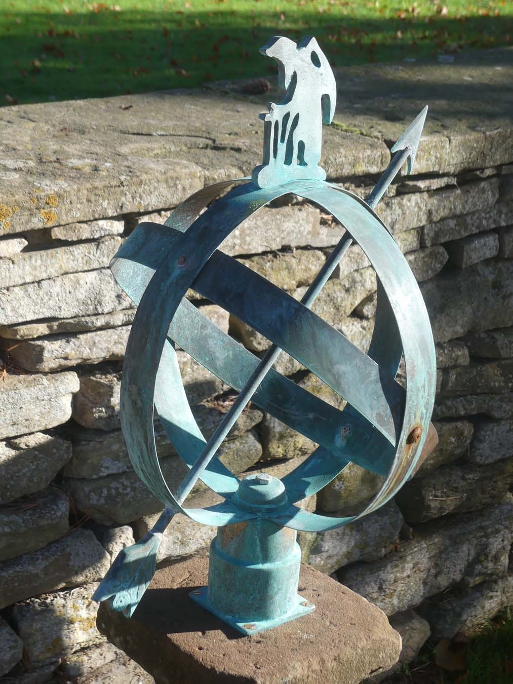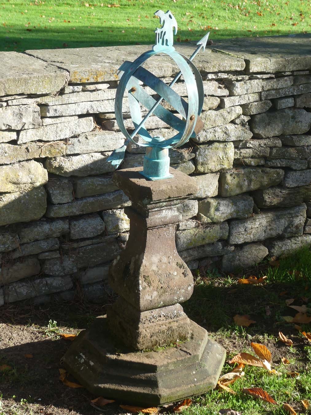 A modern armillary sundial, made from copper and surmounted with a figure of Father Time on a sandstone square baluster column.