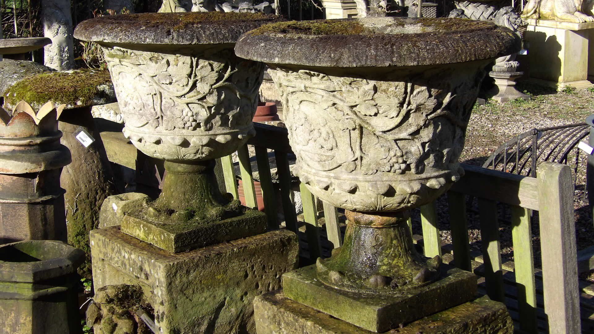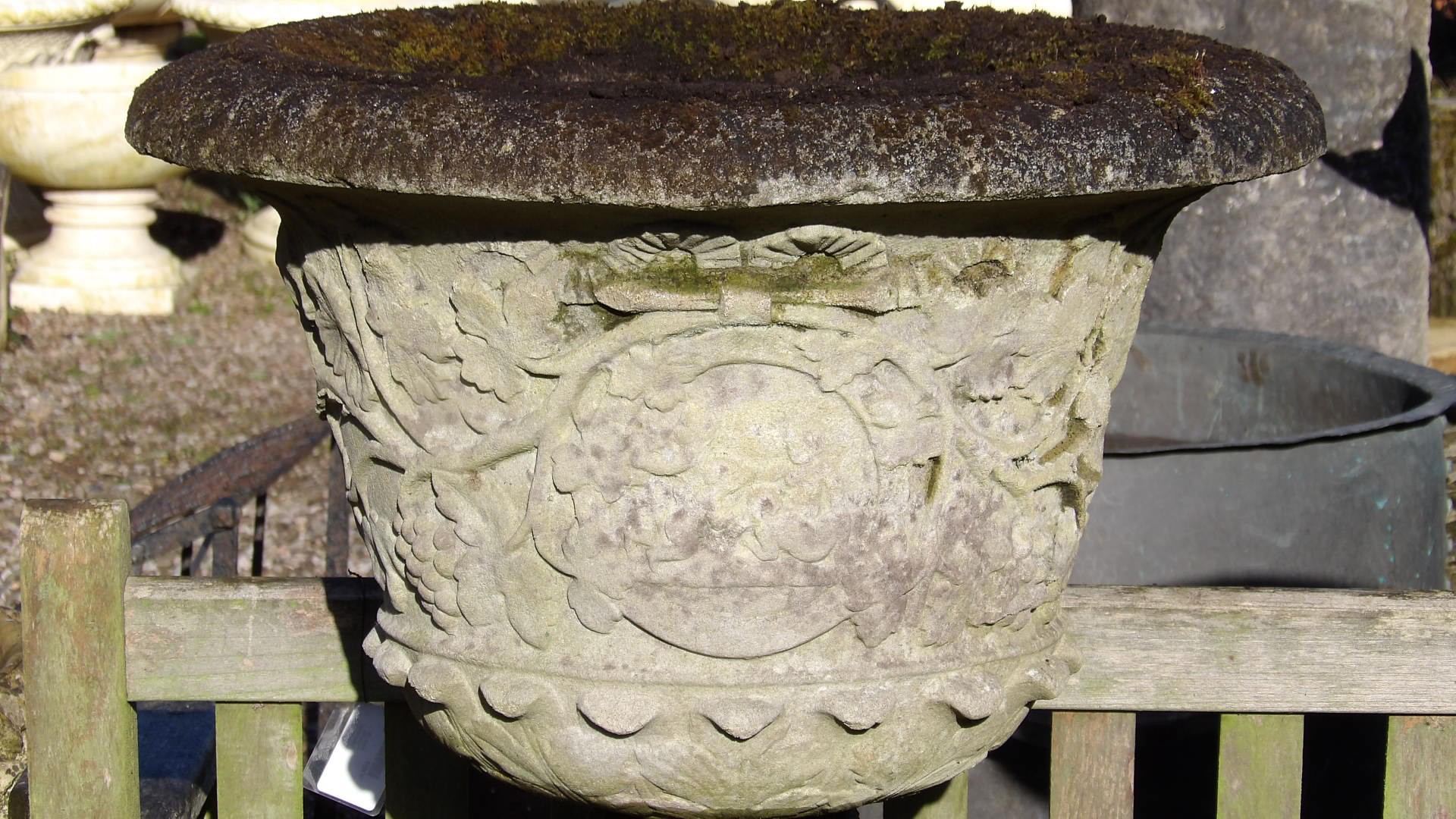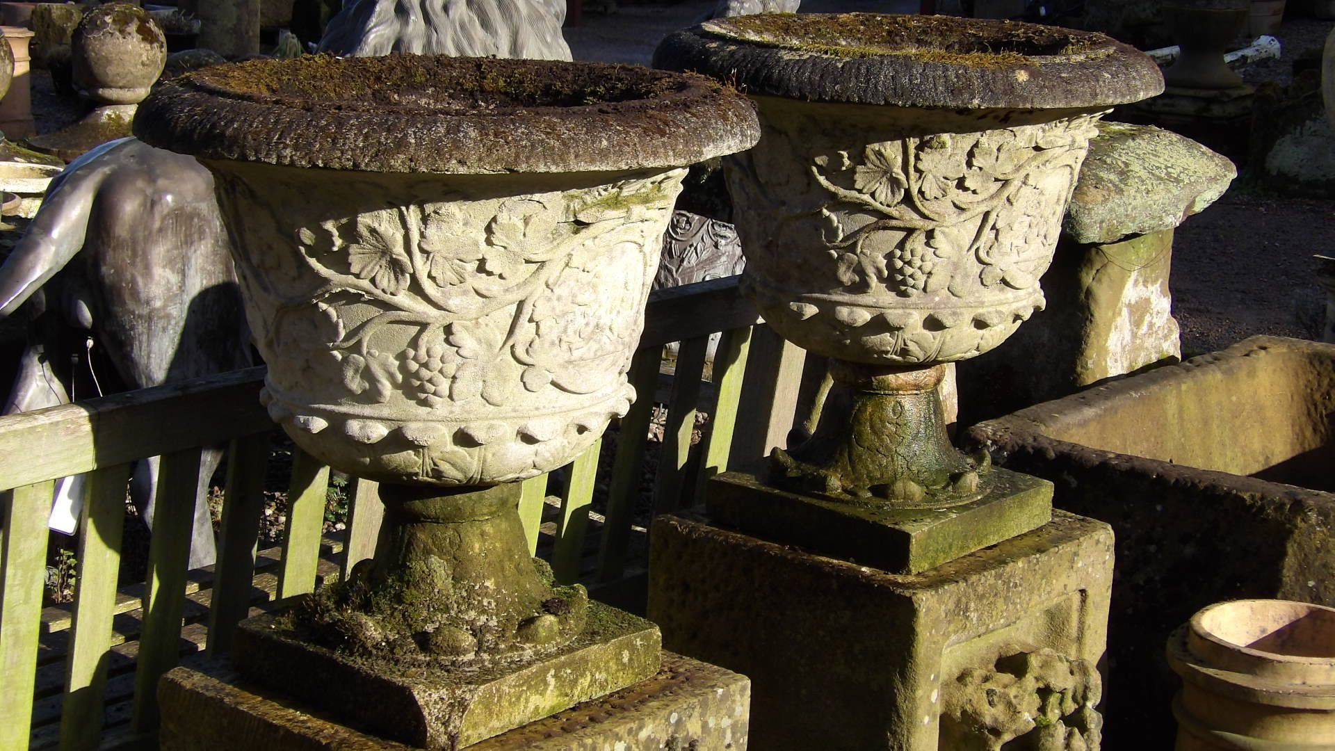 A pair of well weathered composition stone urns with good planting capacity and an attractive pattern of entwined vines.