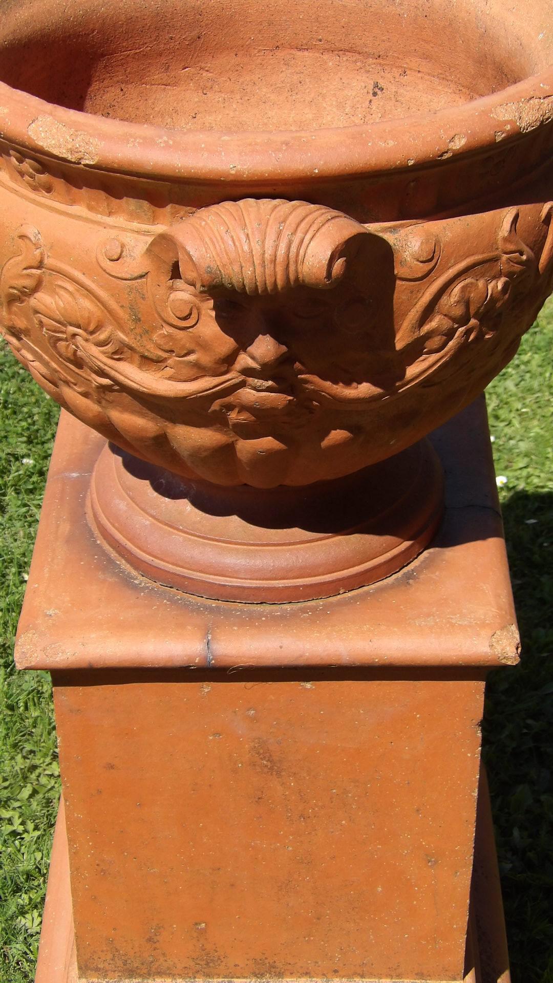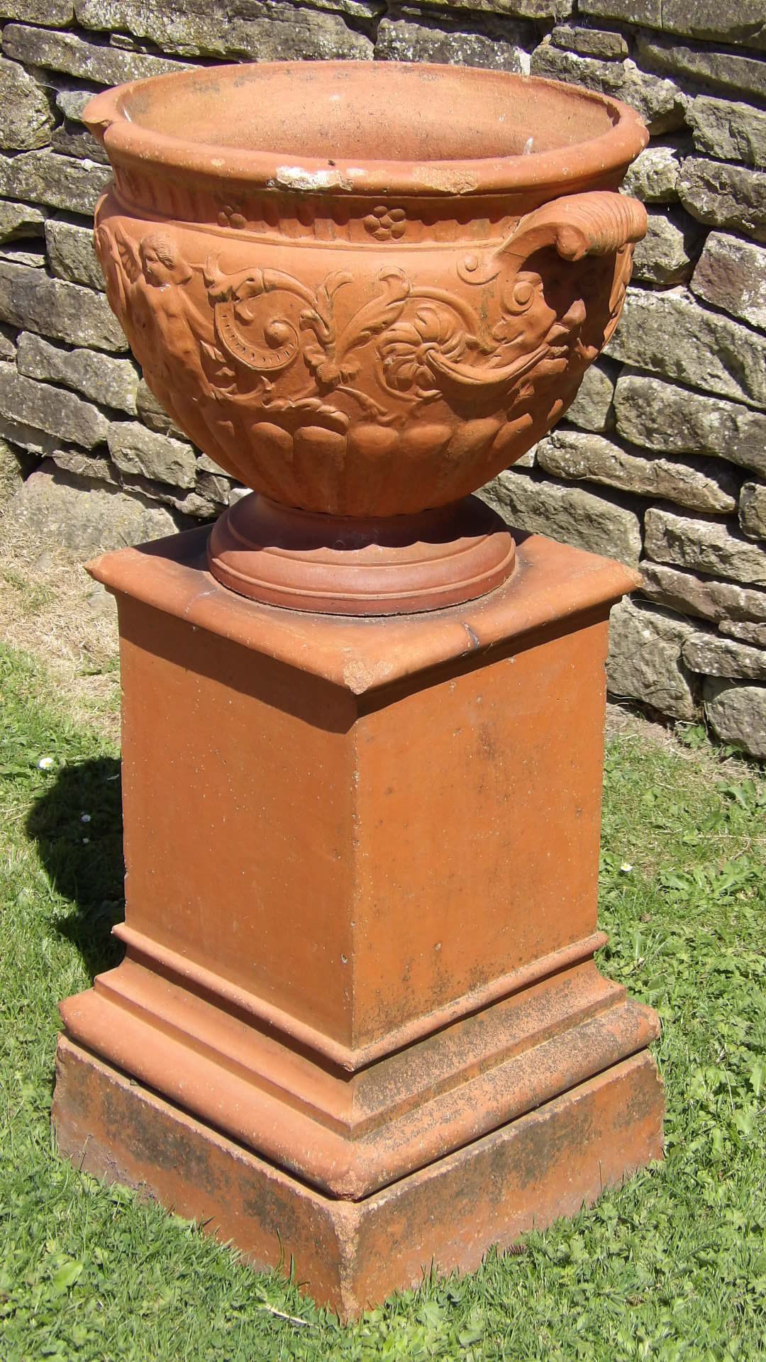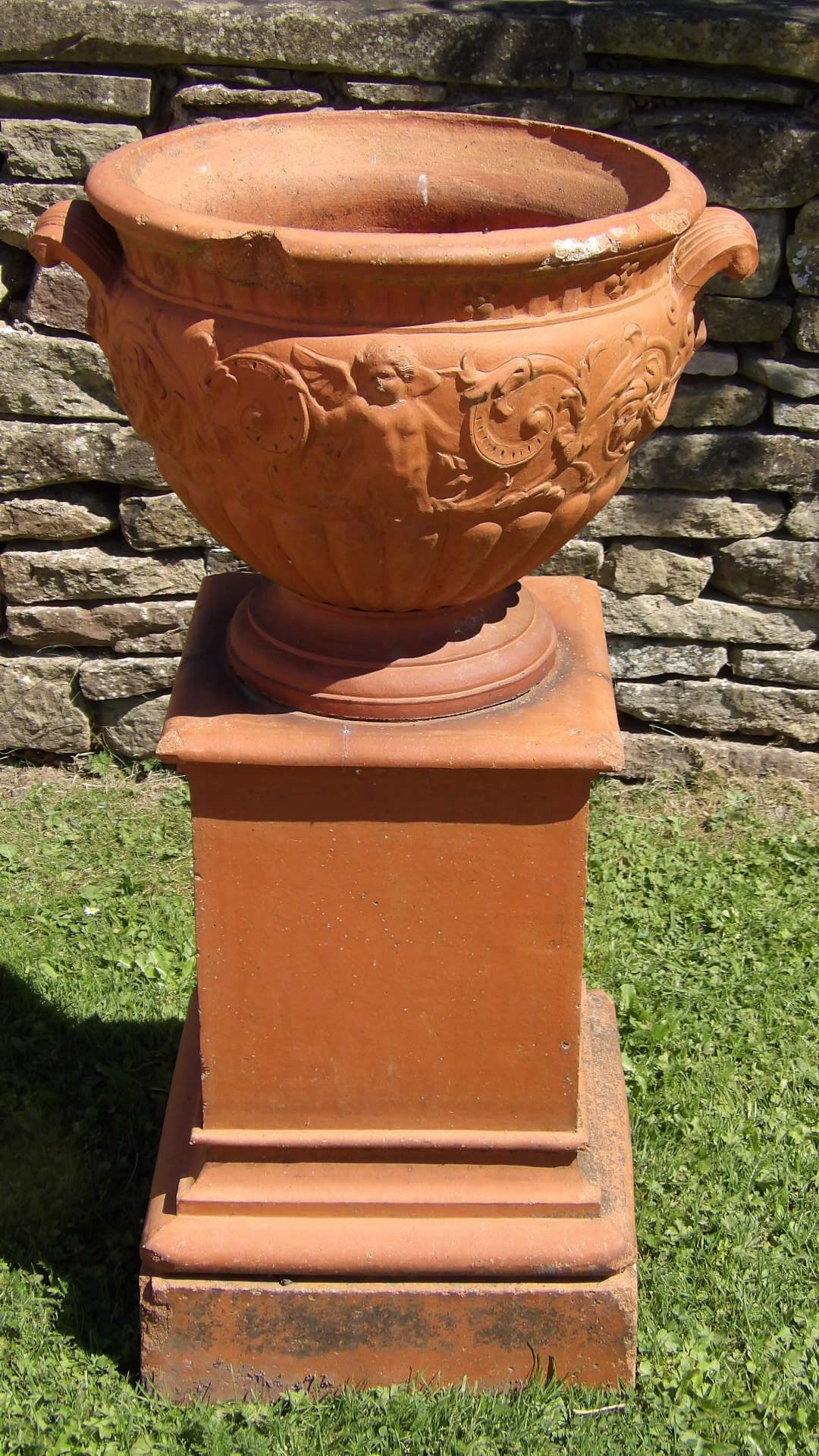 A vintage terracotta urn on plinth, the urn classical in style with twin handles and permanently fixed to the square plinth. The strong red colour of the terracotta suggests that this urn may have been made in the North Midlands but there do not appear to be any maker's marks.