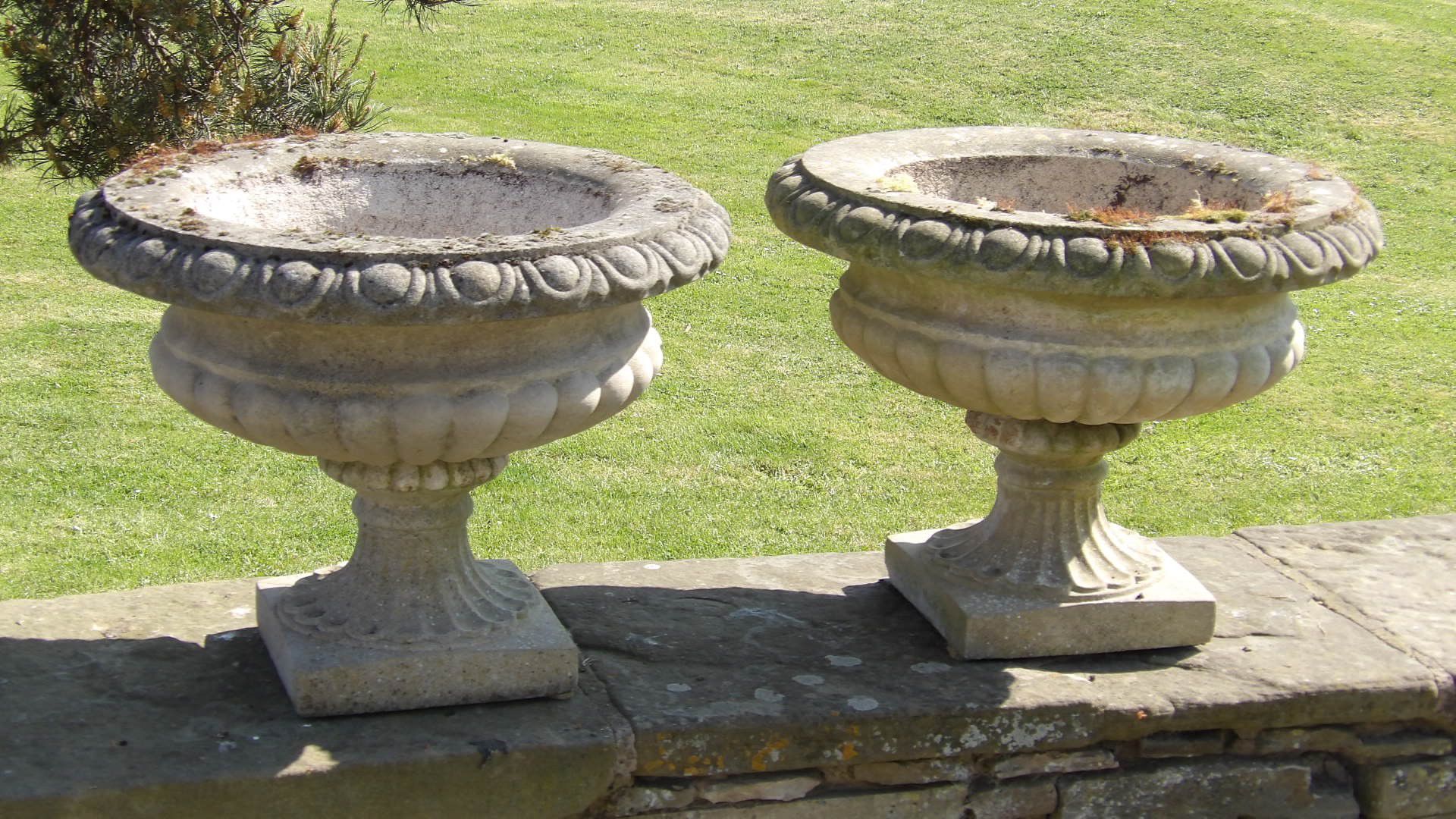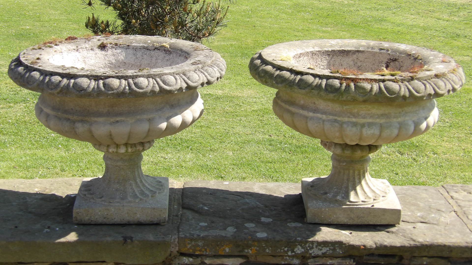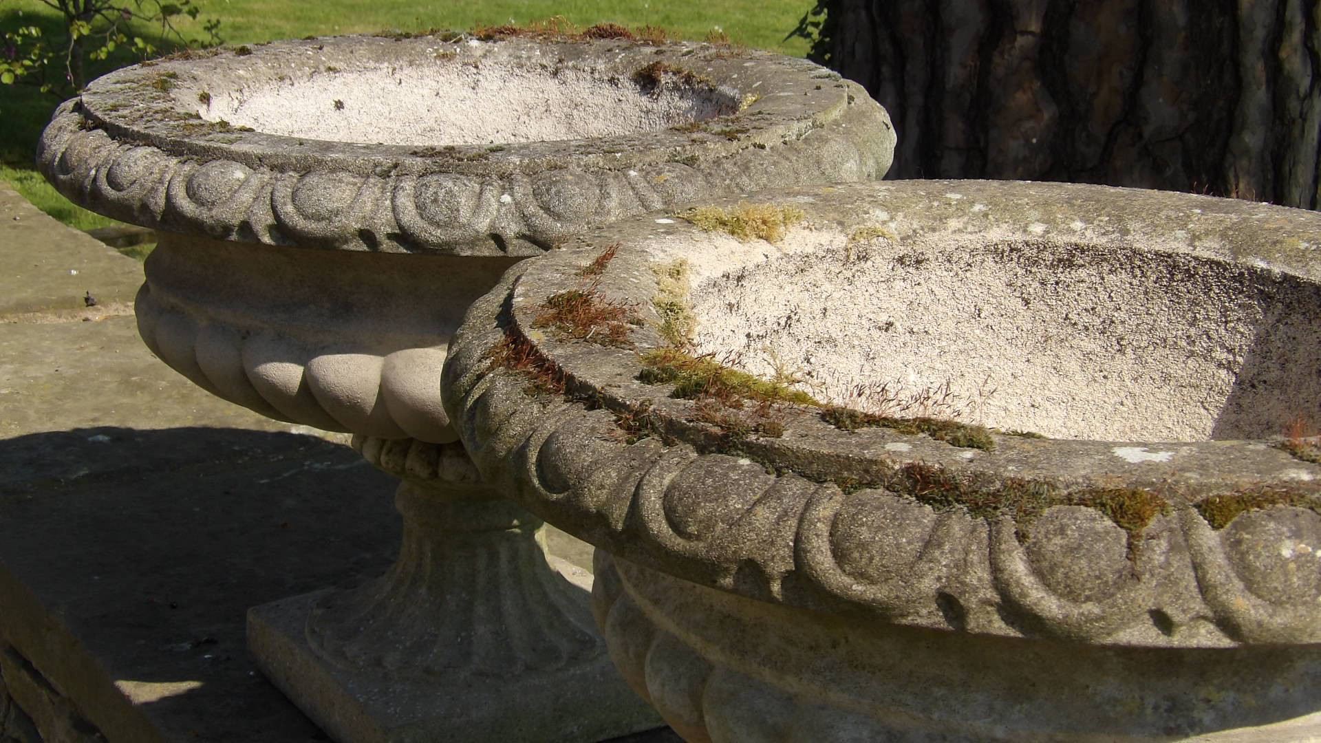 A pair of good quality, composition-stone garden urns which are part weathered and beginning to be colonised by moss and lichen.