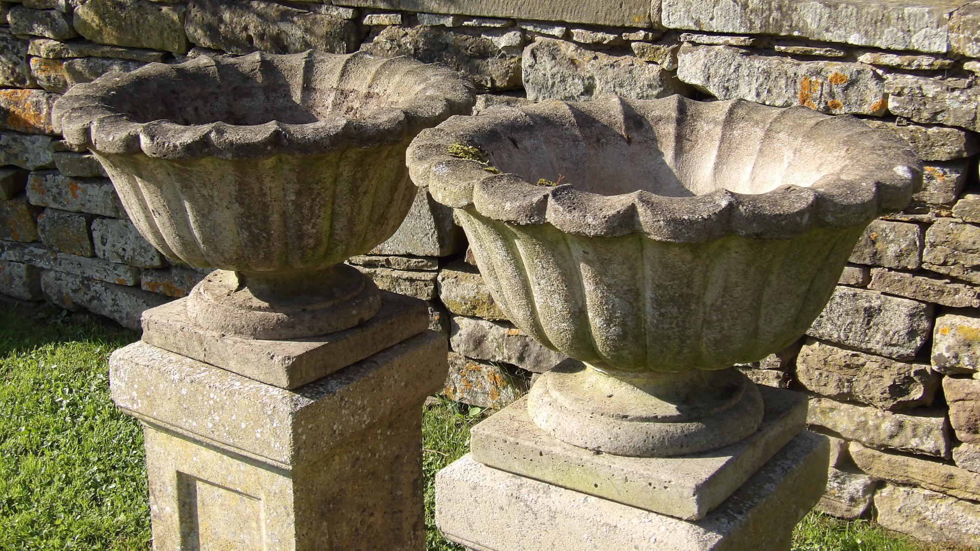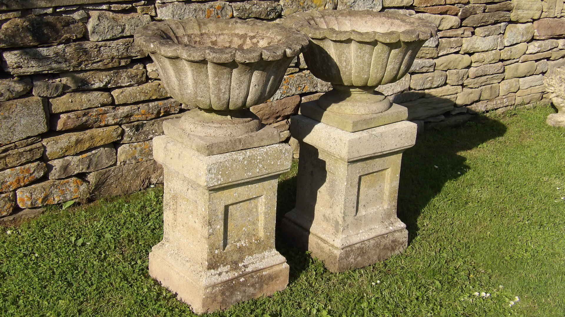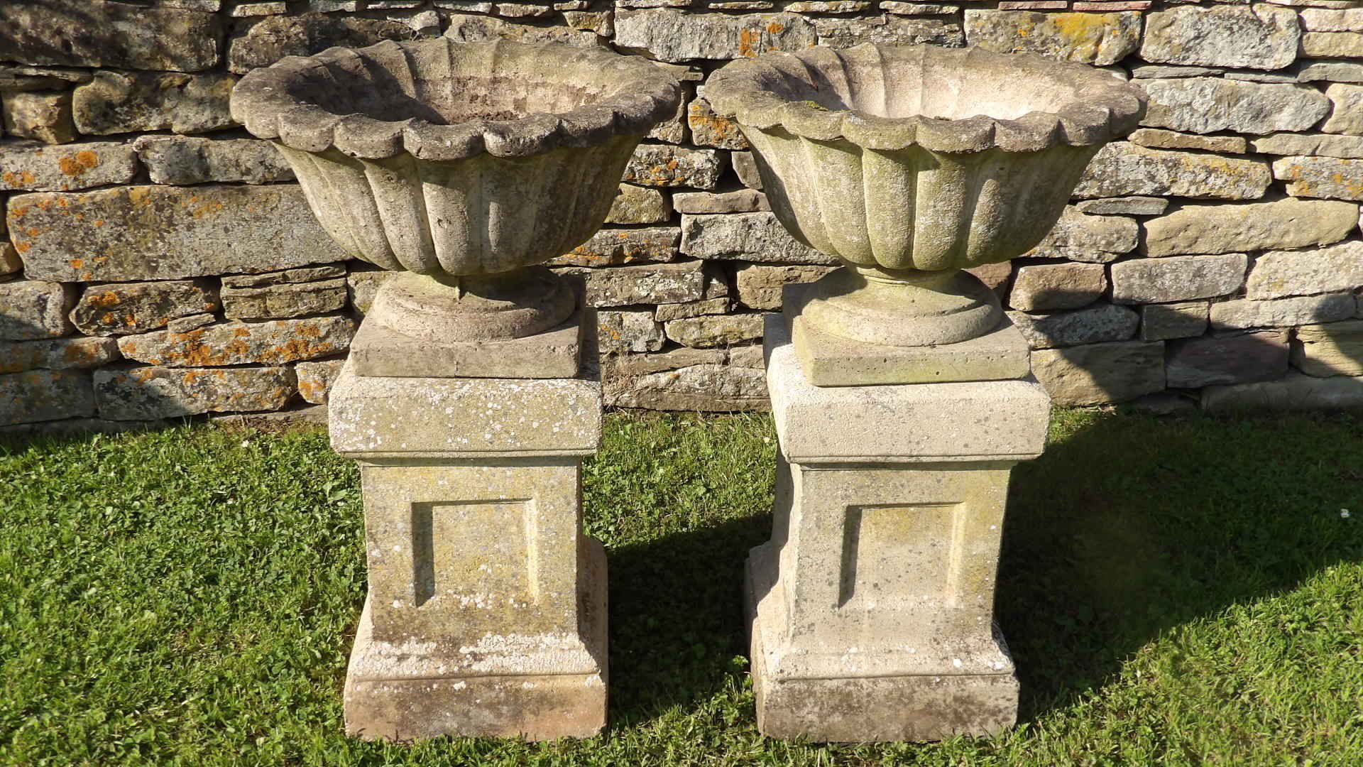 A pair of vintage composition stone garden urns made in an unusual open flower design which provides plenty of room for planting. NB, the plinths in the photograph are sold.