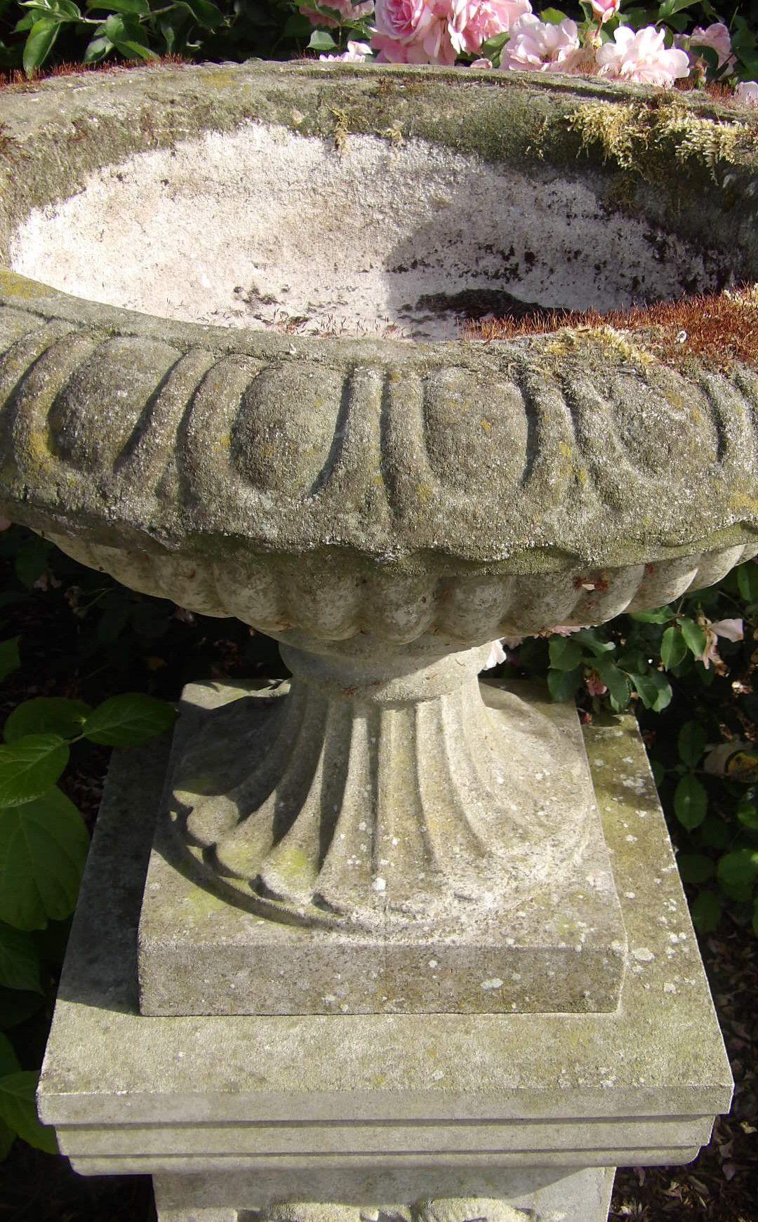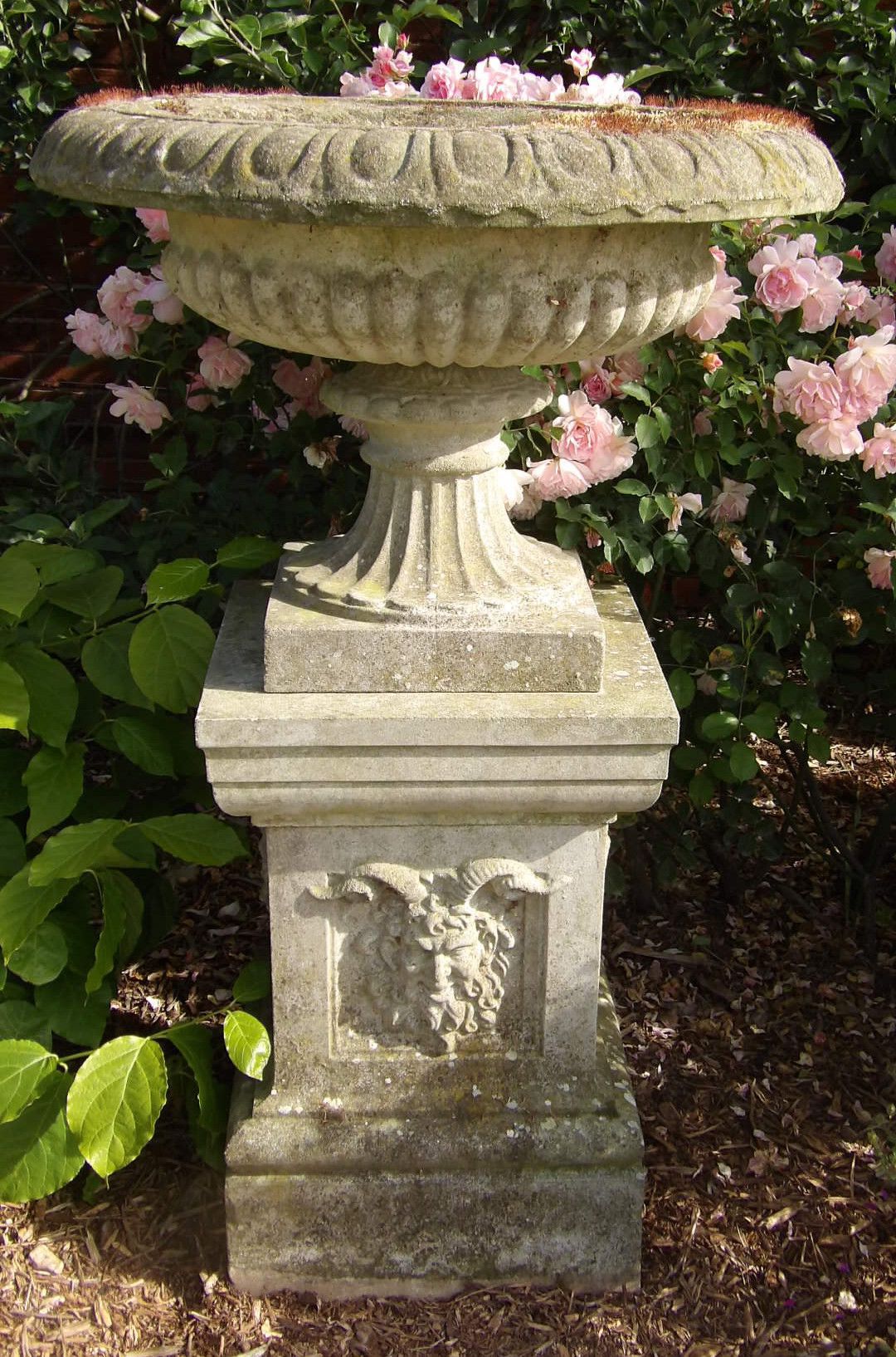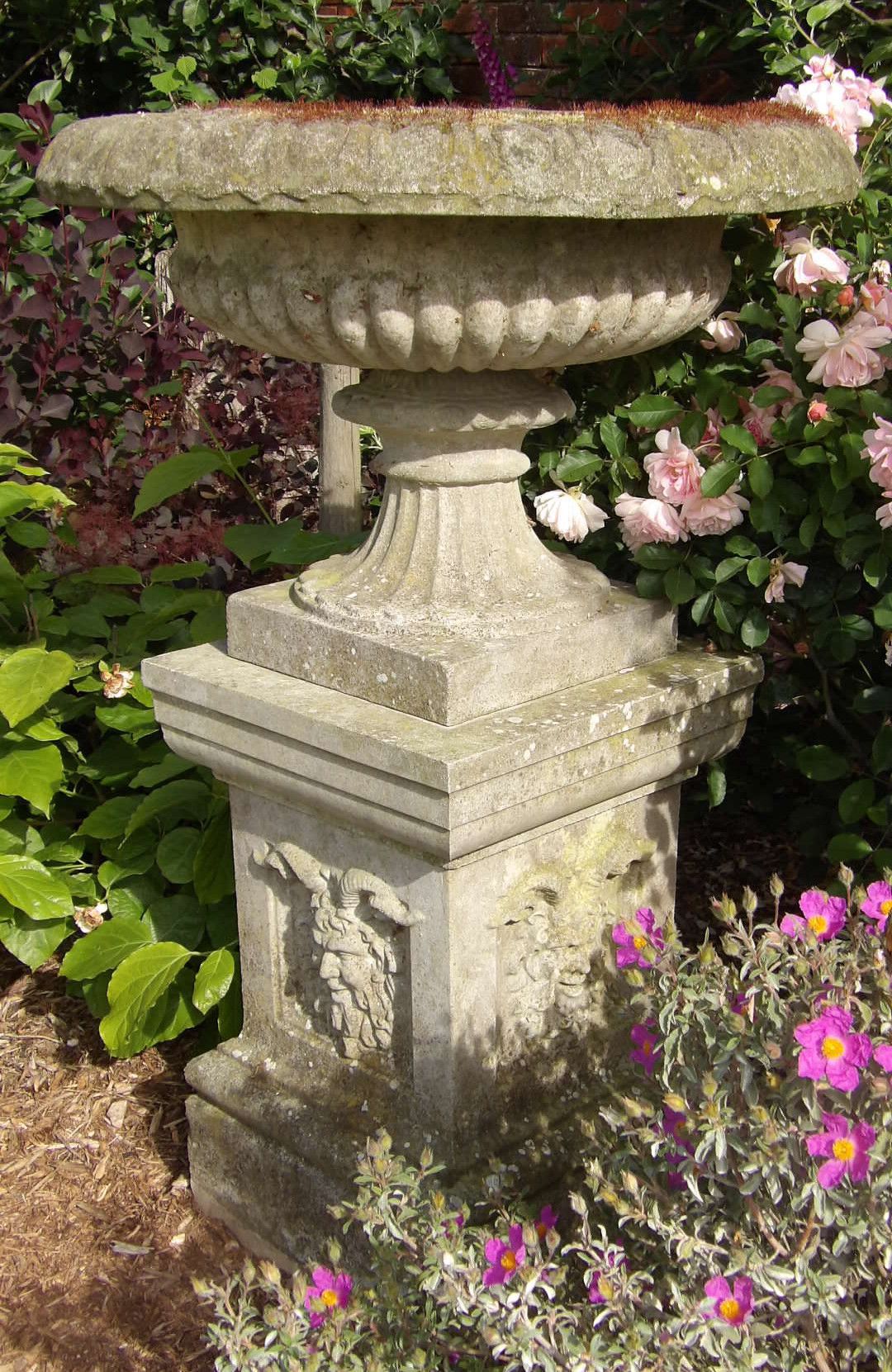 A vintage garden urn on pedestal, the large tazza-shaped urn with a wide egg and dart rim raised on a square plinth decorated with satyr heads. This urn has lots of well established moss and lichen and makes a great focal point for a garden.