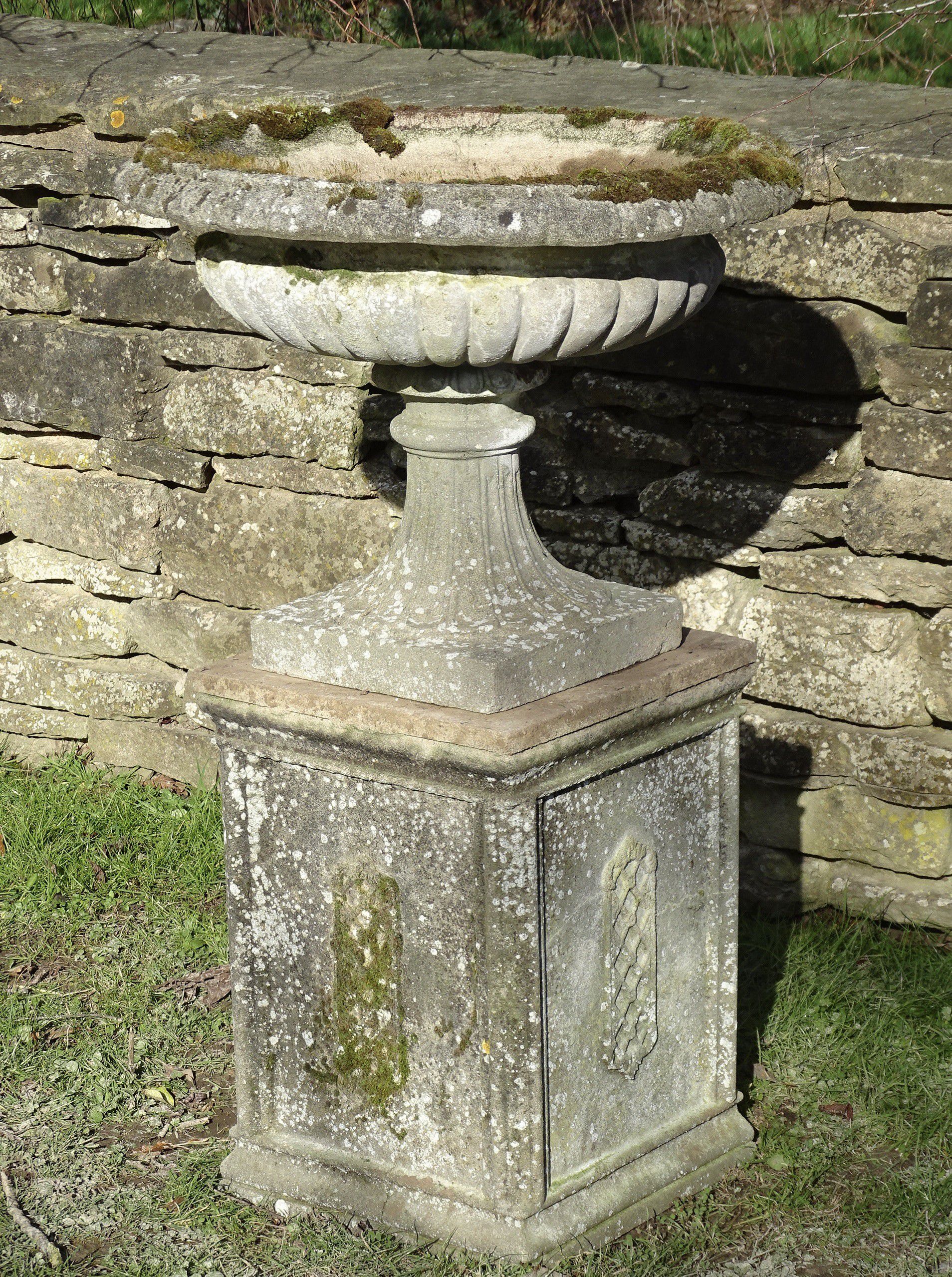 A weathered composition stone garden urn of shallow tazza shape on a matching square base.