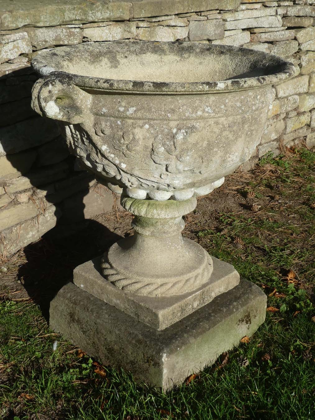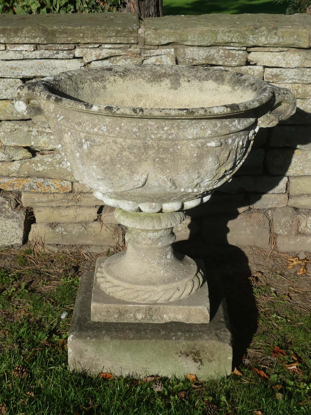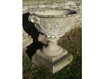 A large weathered garden urn made from composition stone on a separate square sandstone base. The urn has twin loop handles with trailing vines and is an attractive shape with lots of internal planting room, (urn bowl diameter 25").