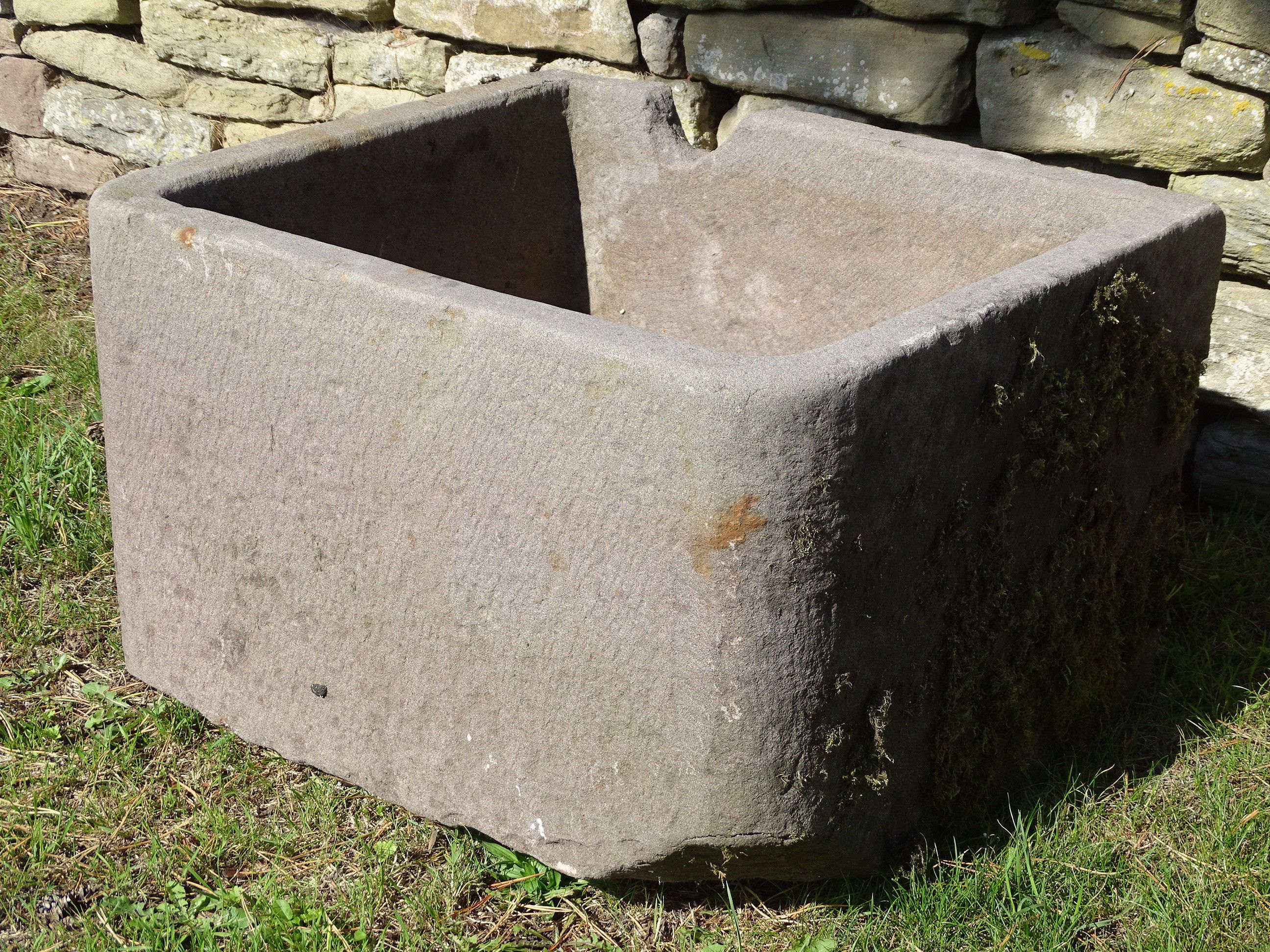 An antique water trough made from pennant stone with rounded front corners and a notch out of the back wall. It is relatively deep for its size and holds water so is ideally suited to be used as a garden water feature.