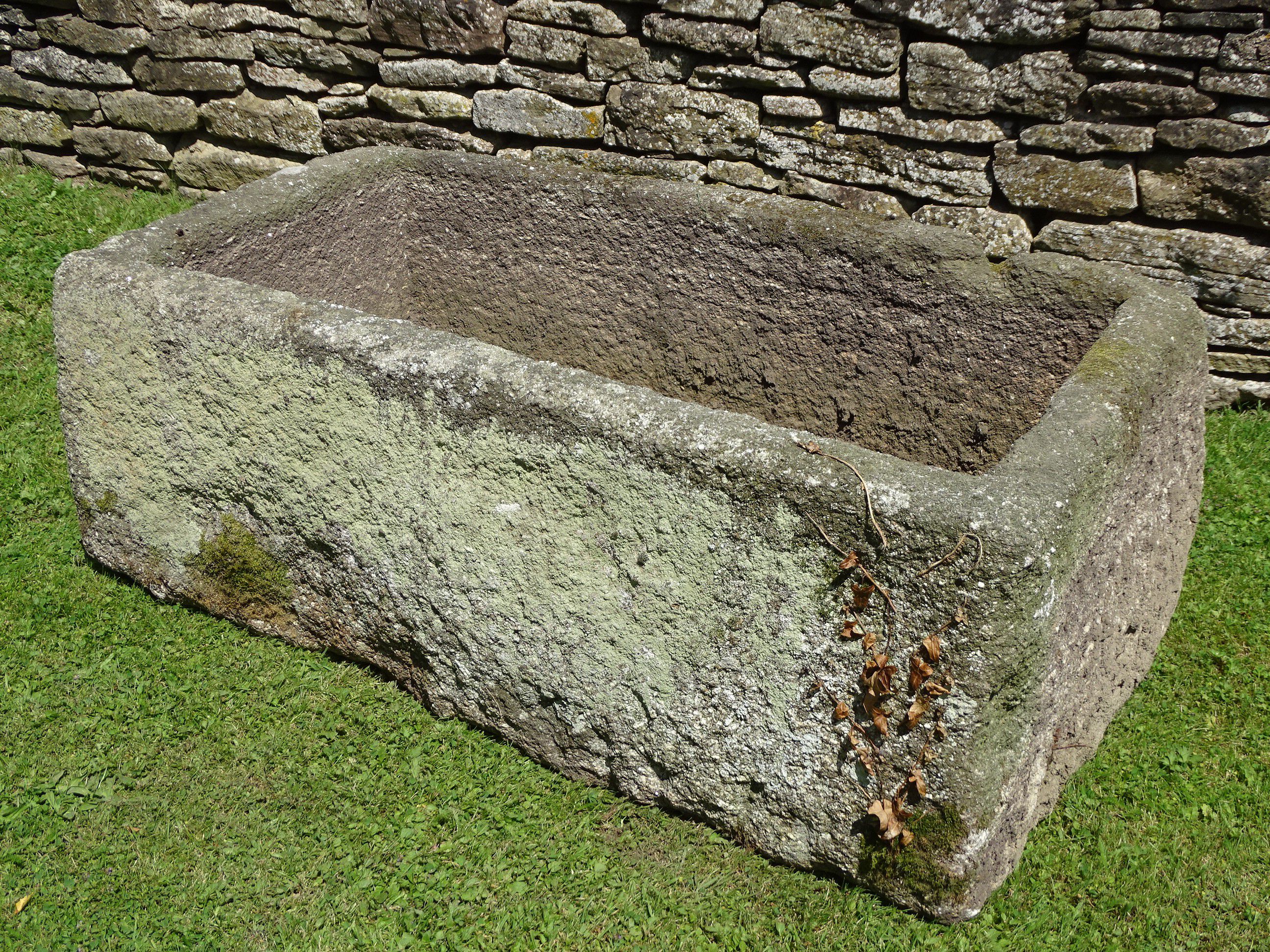 A large antique trough from a farm in North Devon carved from granite in an asymmetrical rectangular shape with an original drainage hole at one end. Originally a water trough for farm animals, it is still watertight and could be re-used as a garden water feature. It is very well weathered and unusually finely carved for a granite trough with relatively thin walls and good internal depth.